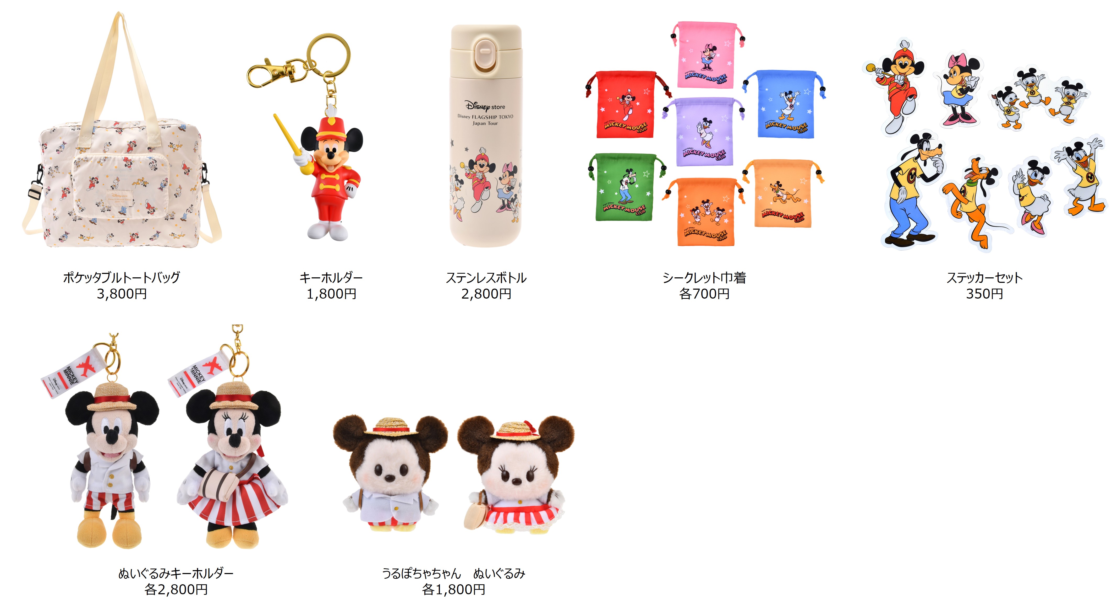 会場限定アイテムに、『ミッキーマウス・クラブ』のアートを使用したアイテムなども加わり、新たに12種類を展開します。旅行に便利なポケッタブルトートバッグやステンレスボトル、キーホルダー、全7種のシークレット巾着など、日常使いにも嬉しい雑貨が充実します。また、ご好評をいただいている、“旅”をテーマにお揃いの帽子を身につけたミッキーマウスとミニーマウスのぬいぐるみキーホルダーや「うるぽちゃちゃん」のぬいぐるみは、赤いストライプの新コスチュームをまとって登場します。