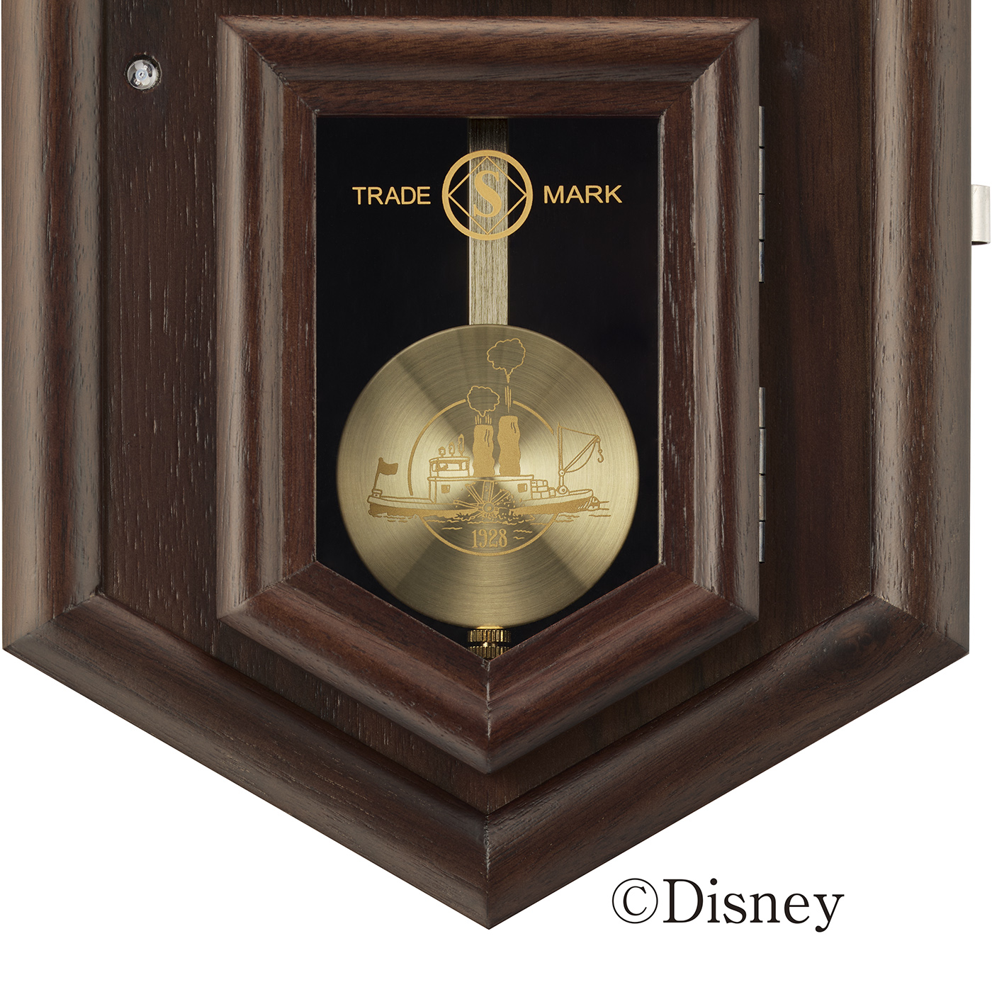 時計前面の開閉が可能なガラス扉には、掛時計の製造を開始してから長年にわたって精工舎の商標として使われた「丸角Sマーク」を配し、クラシカルな意匠を再現しました。また、振り子には蒸気船のイラストが描かれ、『蒸気船ウィリー』の世界を、さりげなく感じることができます。