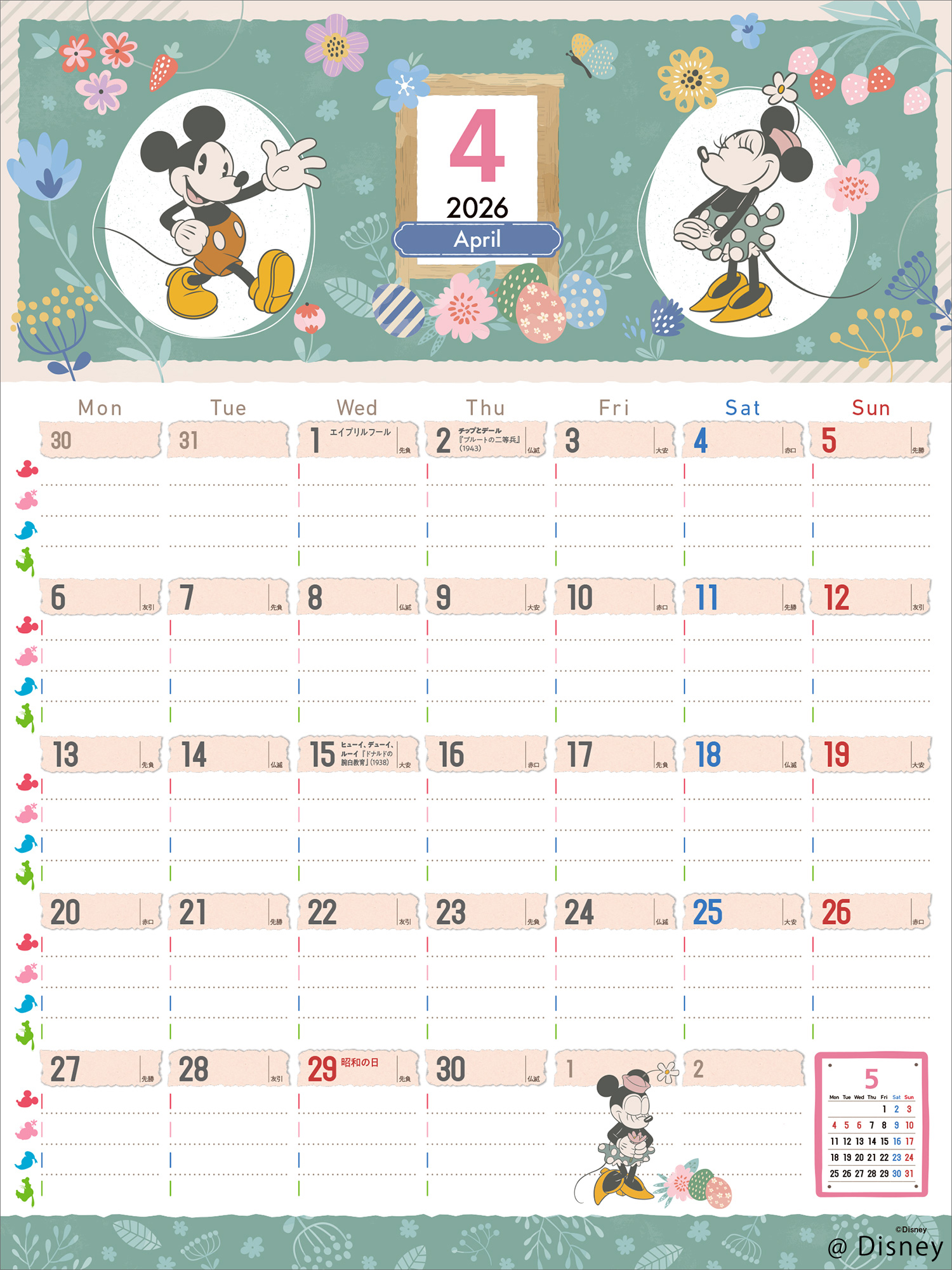 かわいいミッキー&ミニーや『おしゃれキャット』・マリー、美しいプリンセスたち、『くまのプーさん』、『バンビ』、『わんわん物語』など大好きなキャラクターたちが一年を通してあなたのお部屋を飾ります。