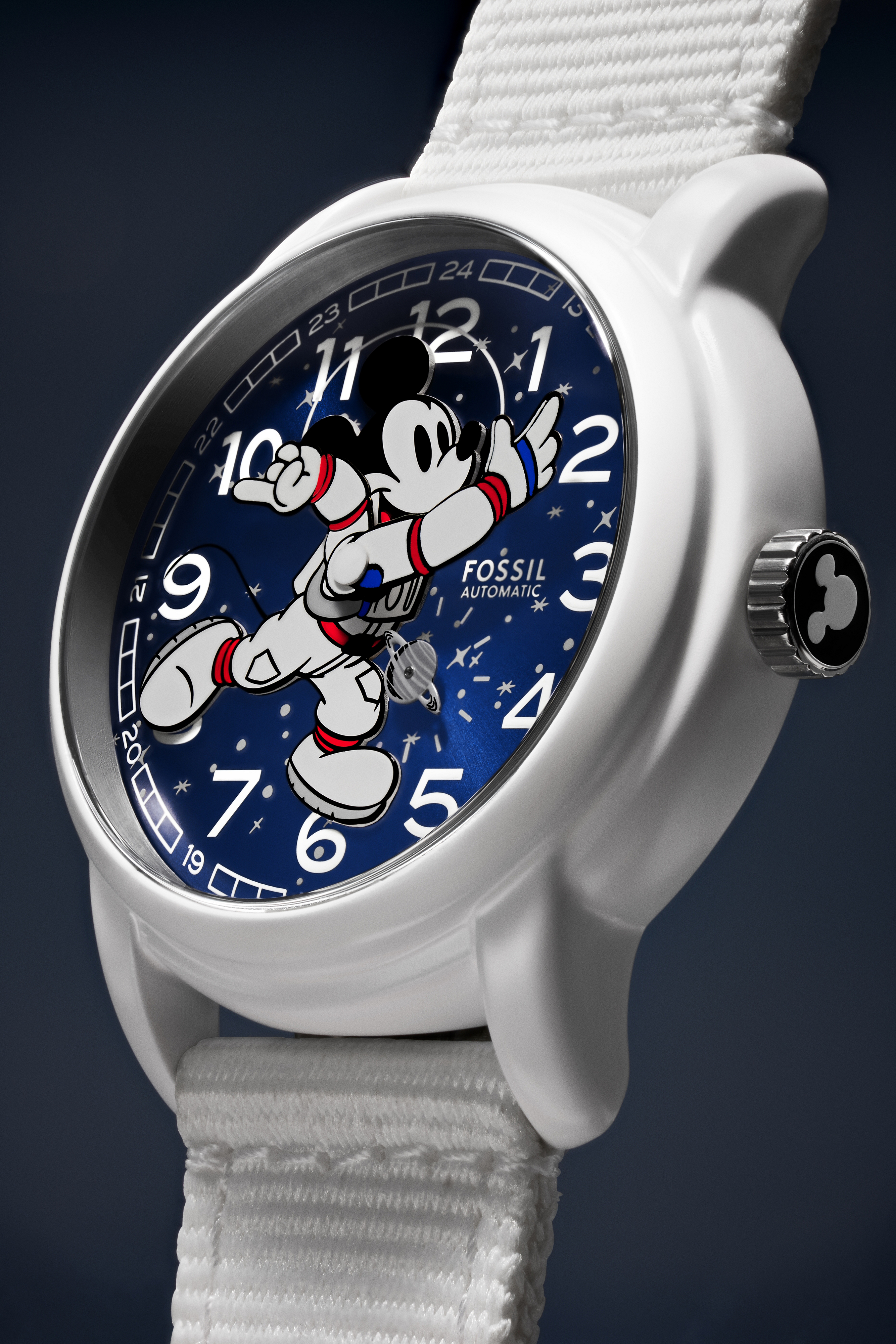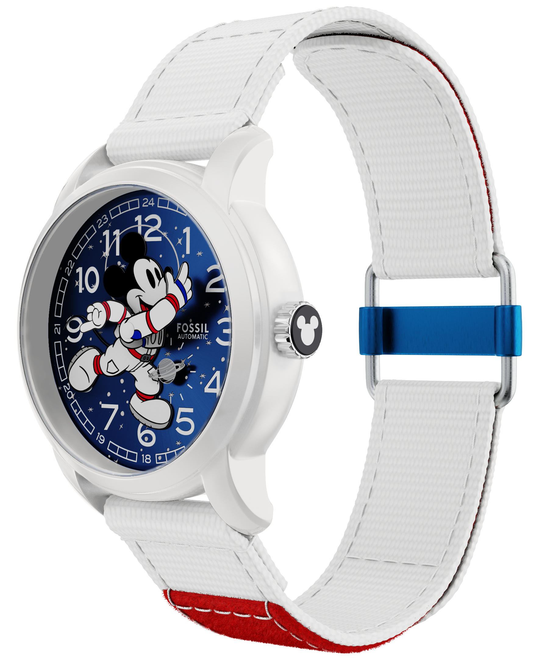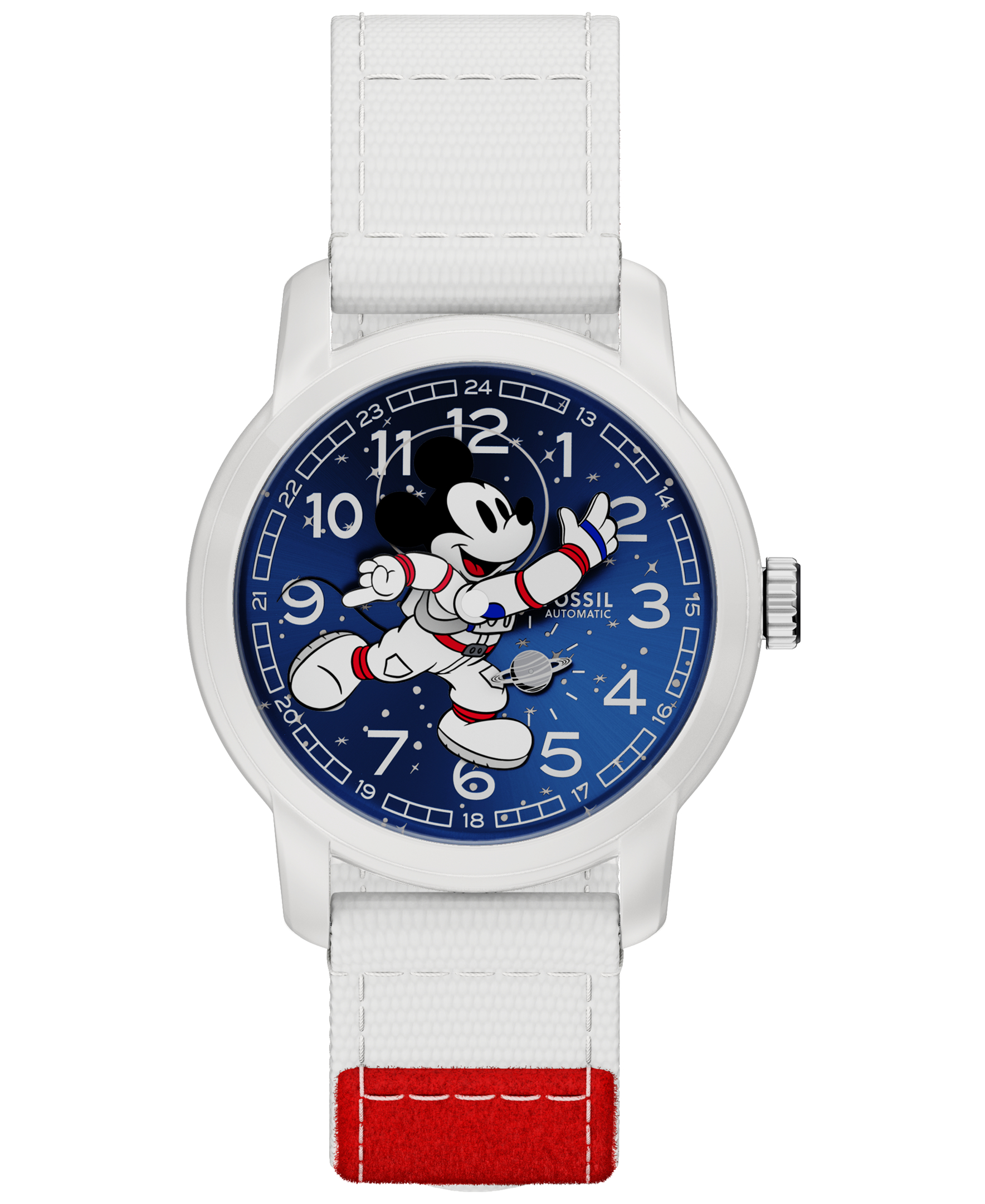 今回のアイテムは、宇宙飛行士に扮したミッキーマウスが、スペースシャトルや宇宙服に見立てたウォッチデザインで登場します。銀河の星々をあしらったディープブルーのダイアルに、宇宙服に身を包んだミッキーの手が時針・分針となり、土星モチーフが秒を刻む自動巻き機械式時計です。ホワイトセラミックコーティングを施したステンレススティールケースは、スペースシャトルに使用される熱反射塗装を想起させ、ホワイトのナイロンストラップは、ミッキーの宇宙服同様のポップなレッドカラーがアクセントとなっています。シースルーケースバックには、ミッキーのカスタムアートとシリアルナンバーが施されています。