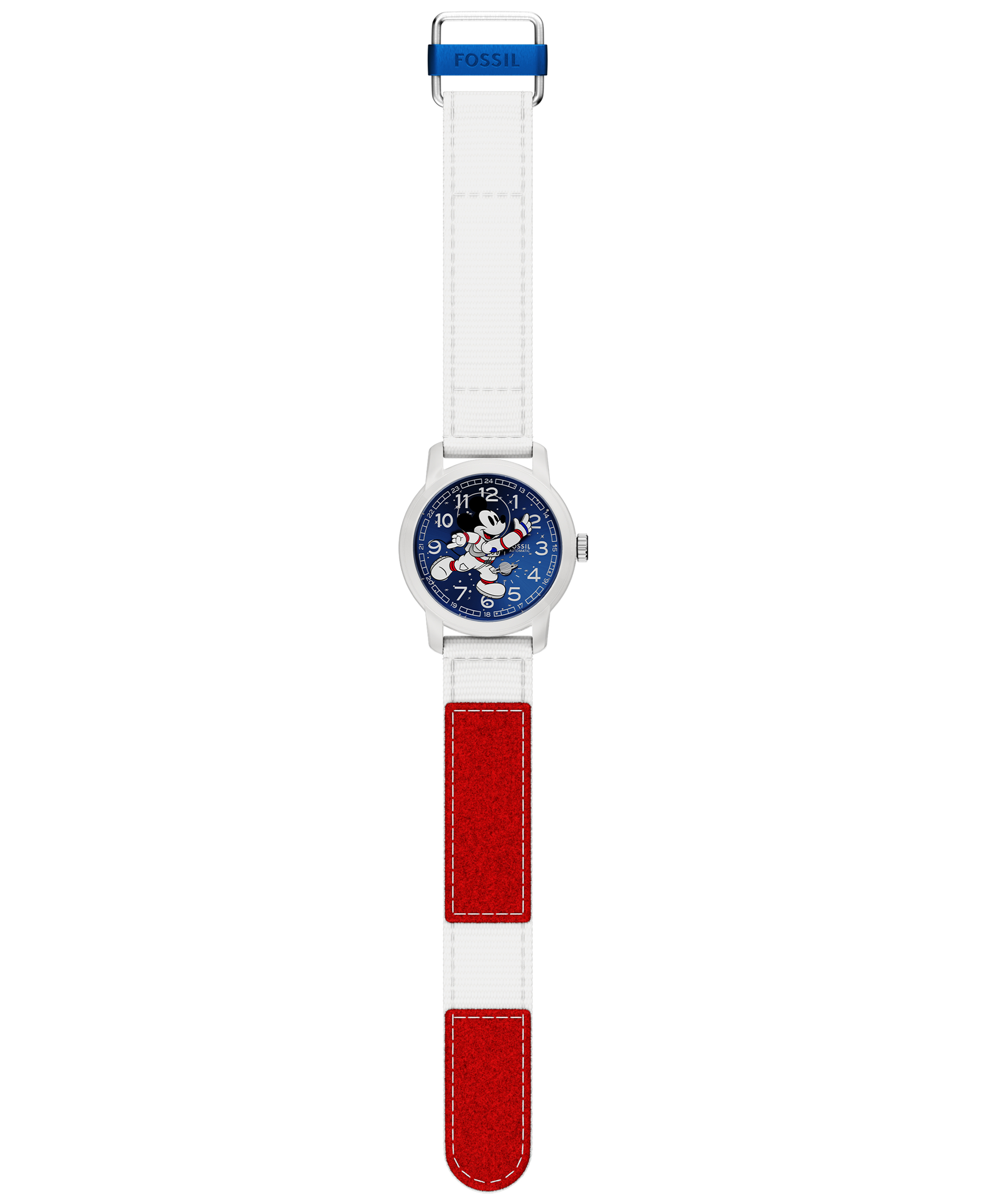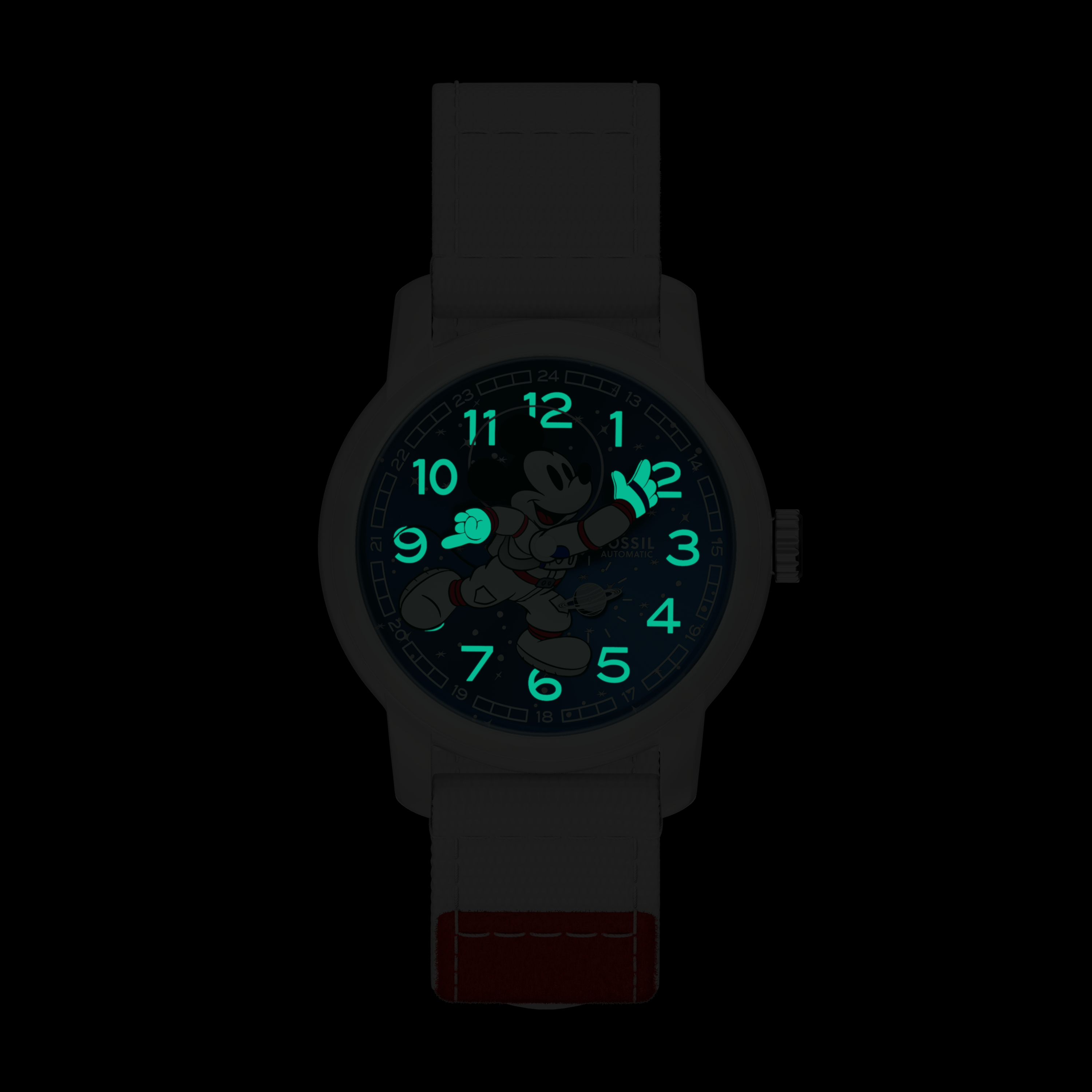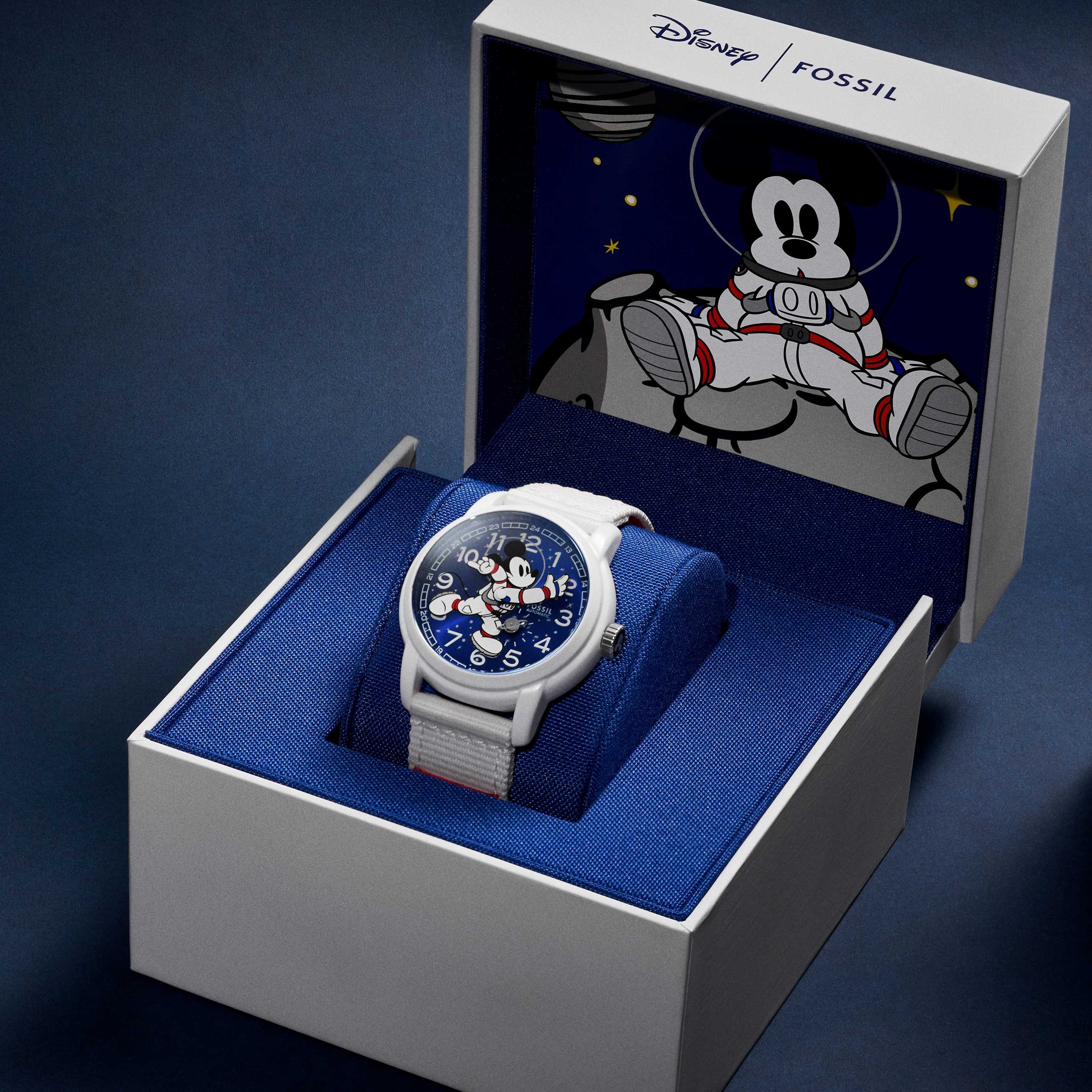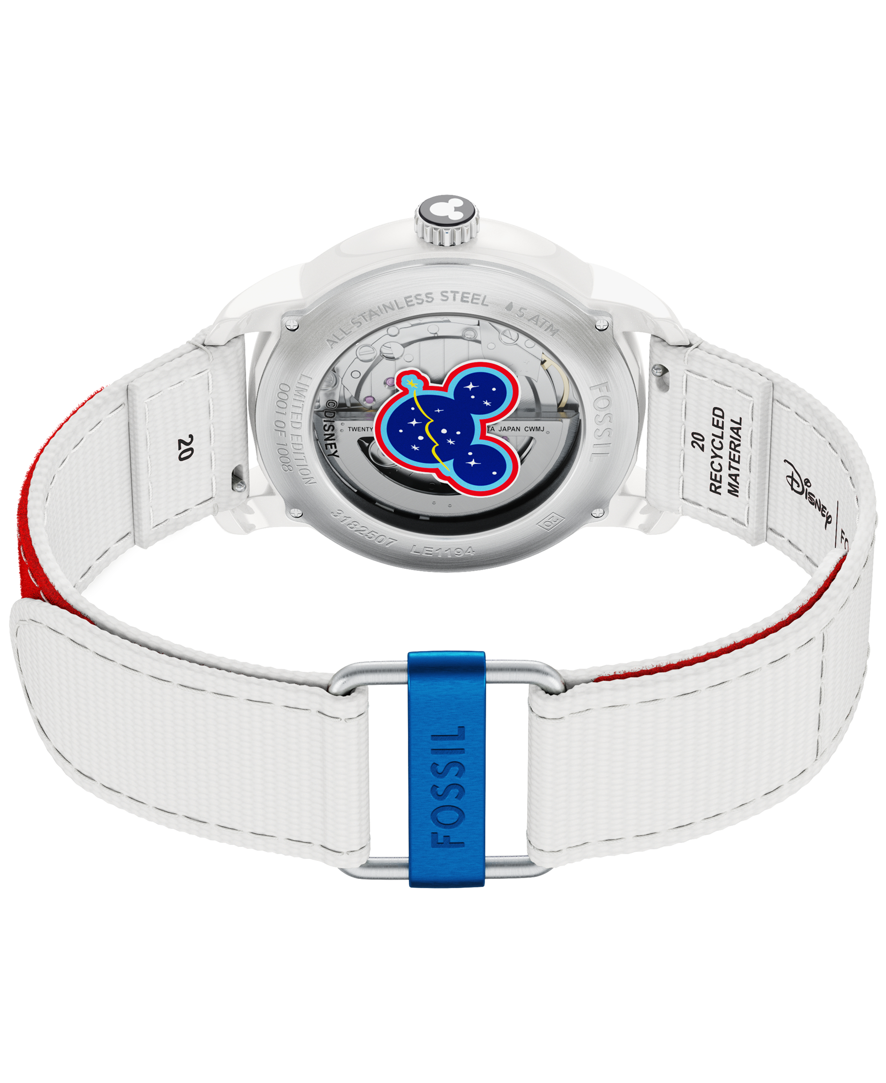 今回のアイテムは、宇宙飛行士に扮したミッキーマウスが、スペースシャトルや宇宙服に見立てたウォッチデザインで登場します。銀河の星々をあしらったディープブルーのダイアルに、宇宙服に身を包んだミッキーの手が時針・分針となり、土星モチーフが秒を刻む自動巻き機械式時計です。ホワイトセラミックコーティングを施したステンレススティールケースは、スペースシャトルに使用される熱反射塗装を想起させ、ホワイトのナイロンストラップは、ミッキーの宇宙服同様のポップなレッドカラーがアクセントとなっています。シースルーケースバックには、ミッキーのカスタムアートとシリアルナンバーが施されています。