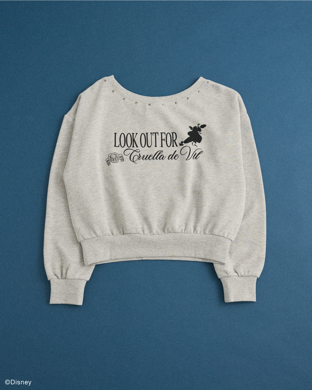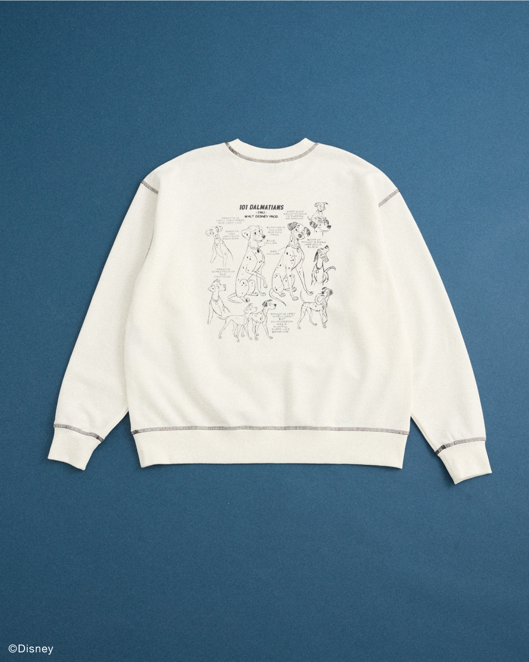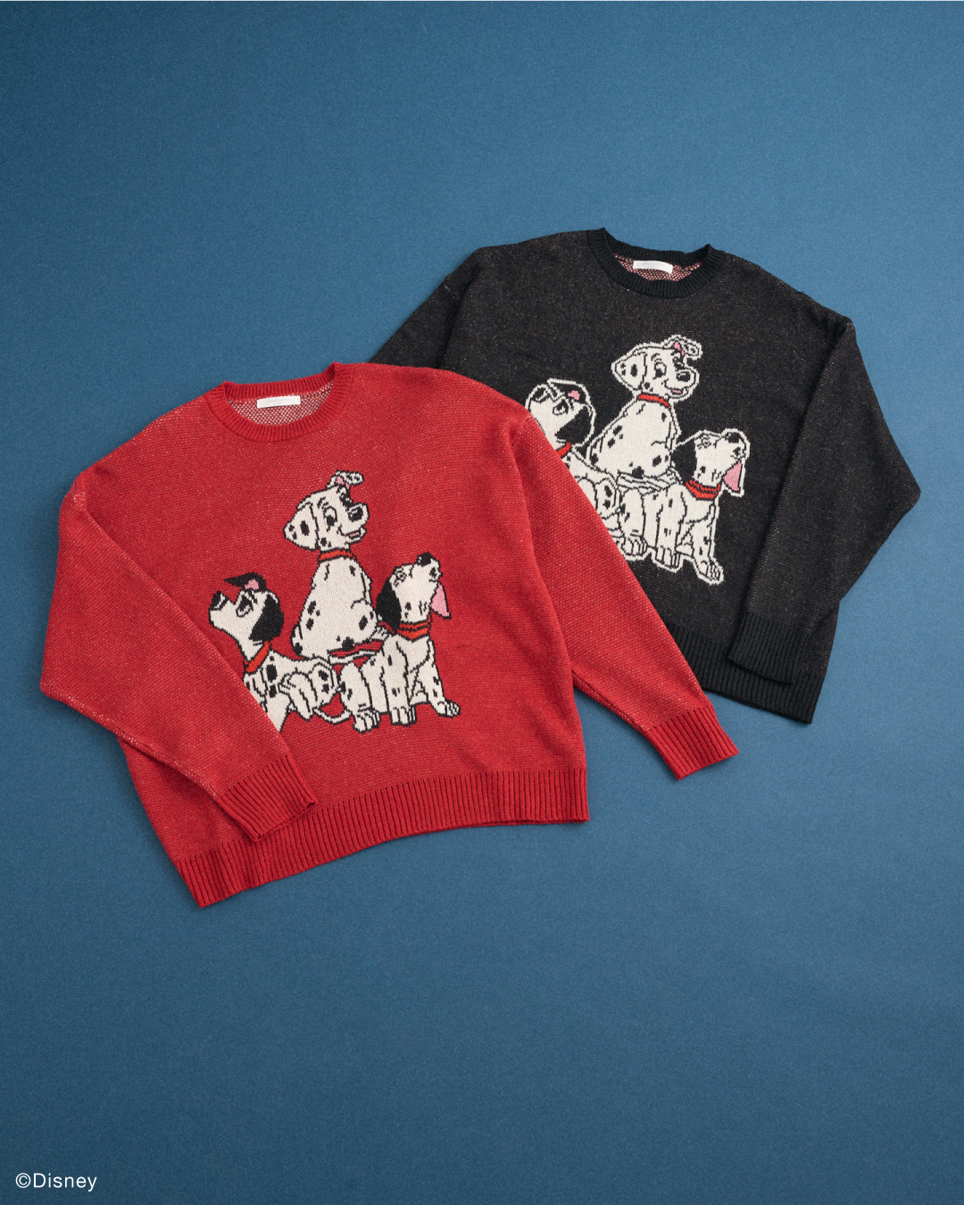 キュートなキャラクターアートが目を惹くトップスは4型をラインアップ。これからのシーズンに重宝するジャガードニットには、子犬の「ラッキー」「ローリー」「パッチ」の愛らしい姿をデザインしました。ダルメシアンたちが大集合したスウェットには、「ポンゴ」と「パディータ」が15匹の子犬たちに囲まれるシーンをプリント。ポロ衿スウェットには、「ローリー」と「パッチ」が仲良く寄り添う姿をエンブレム風に表現しました。また、手書き風アートをバックプリントしたスウェットや、毛皮好きの悪女「クルエラ」がモチーフのオフショルスウェットもご用意。