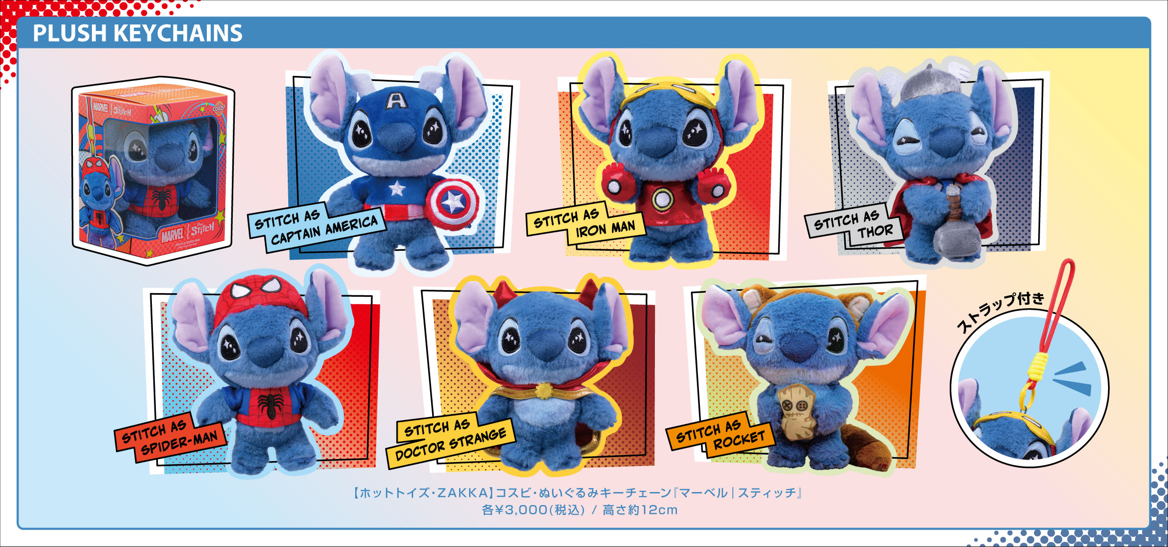 大きさは高さ約12cmで、キーチェーンとして使用できるストラップがついている。ラインナップは、スパイダーマン、アイアンマン、キャプテン・アメリカ、ソー、ドクター・ストレンジ、ロケットの格好をしたスティッチの全6種。
