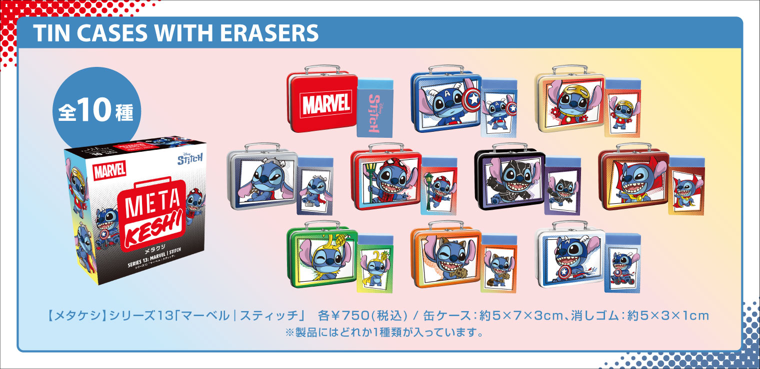 ホットトイズのフラッグシップ・ストア「トイサピエンス」のオリジナル企画、缶ケースと消しゴムをセットした「メタケシ」シリーズに、「マーベル|スティッチ」が登場!ラインナップは全10種。缶ケースは、小物入れとしても使用することができ、普段使いしやすいステーショナリーとなっている。パッケージは、中に何が入っているか分からないワクワク感が楽しめるブラインドボックス仕様だ。