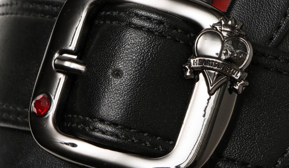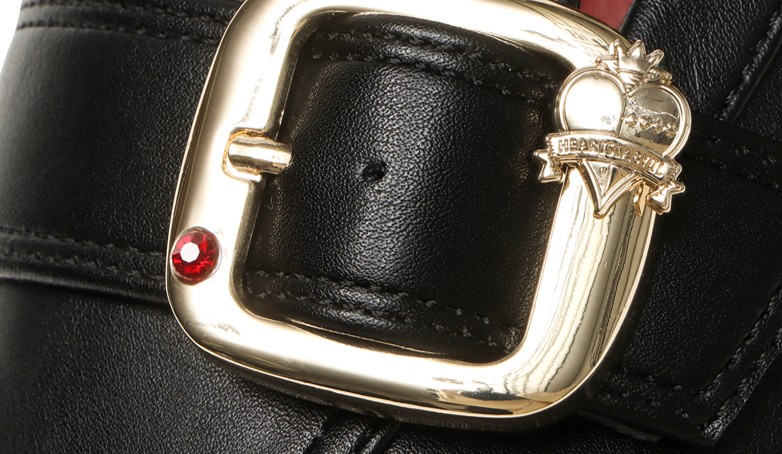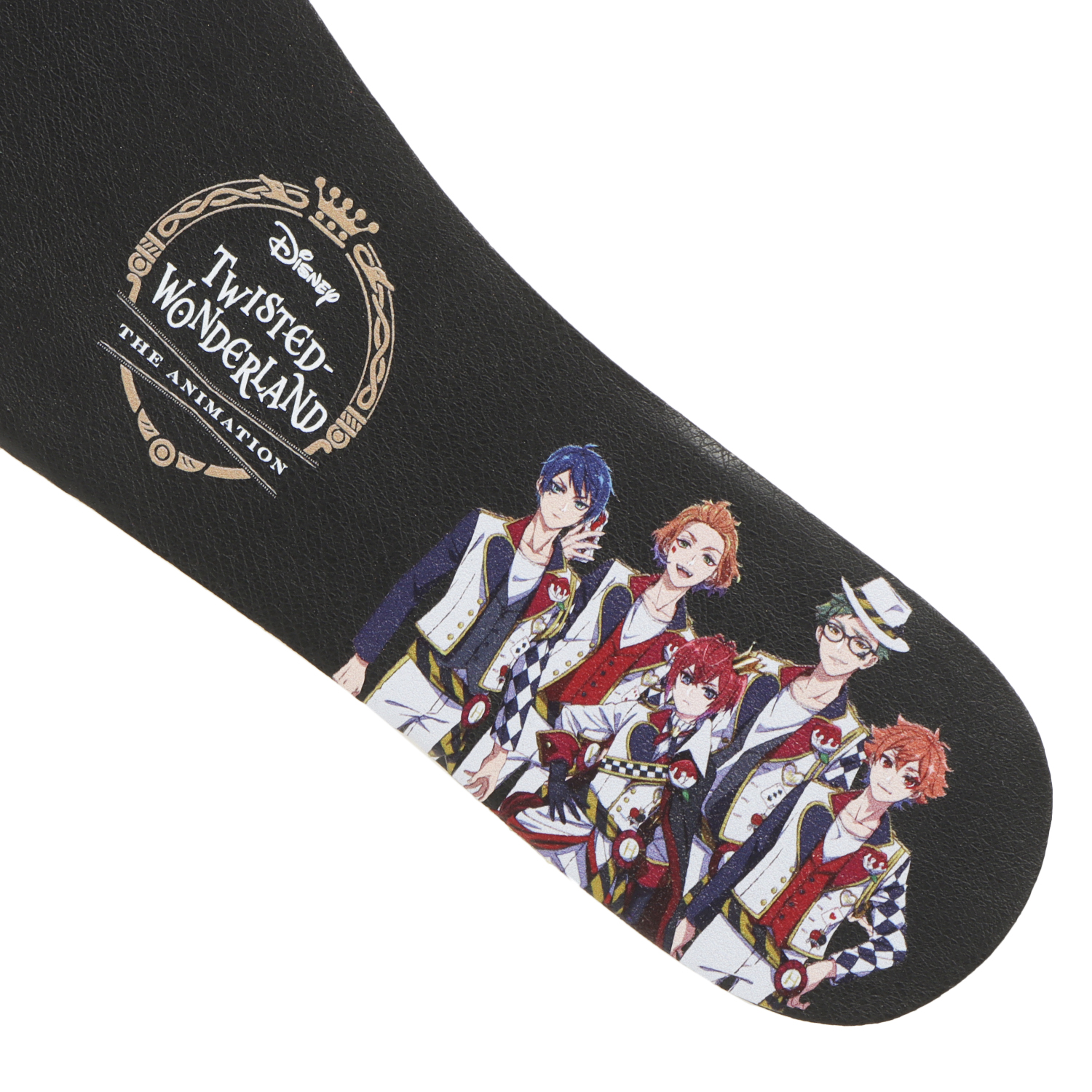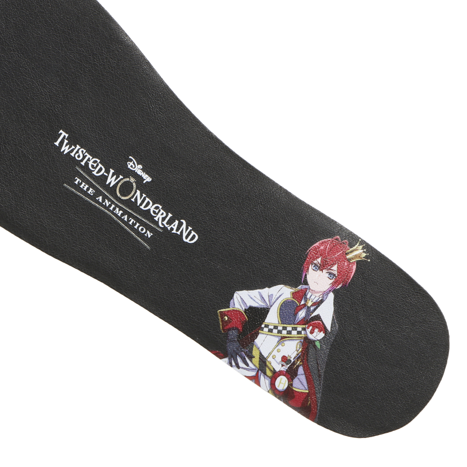 最大の特徴である留め具には、ハーツラビュル寮のエンブレムが刻印。リドル(寮長)モデルでは、華やかさと威厳を表す金色のエンブレムを、寮生モデルでは、作品のダークで幻想的な世界観に合わせたメタルカラーのエンブレムを採用しています。インソールにはキャラクターを描いており、着用していない時でも作品の世界観を感じられる特別な仕様となっています。また、付属するシューズボックスやショッパーもオリジナルデザインです。