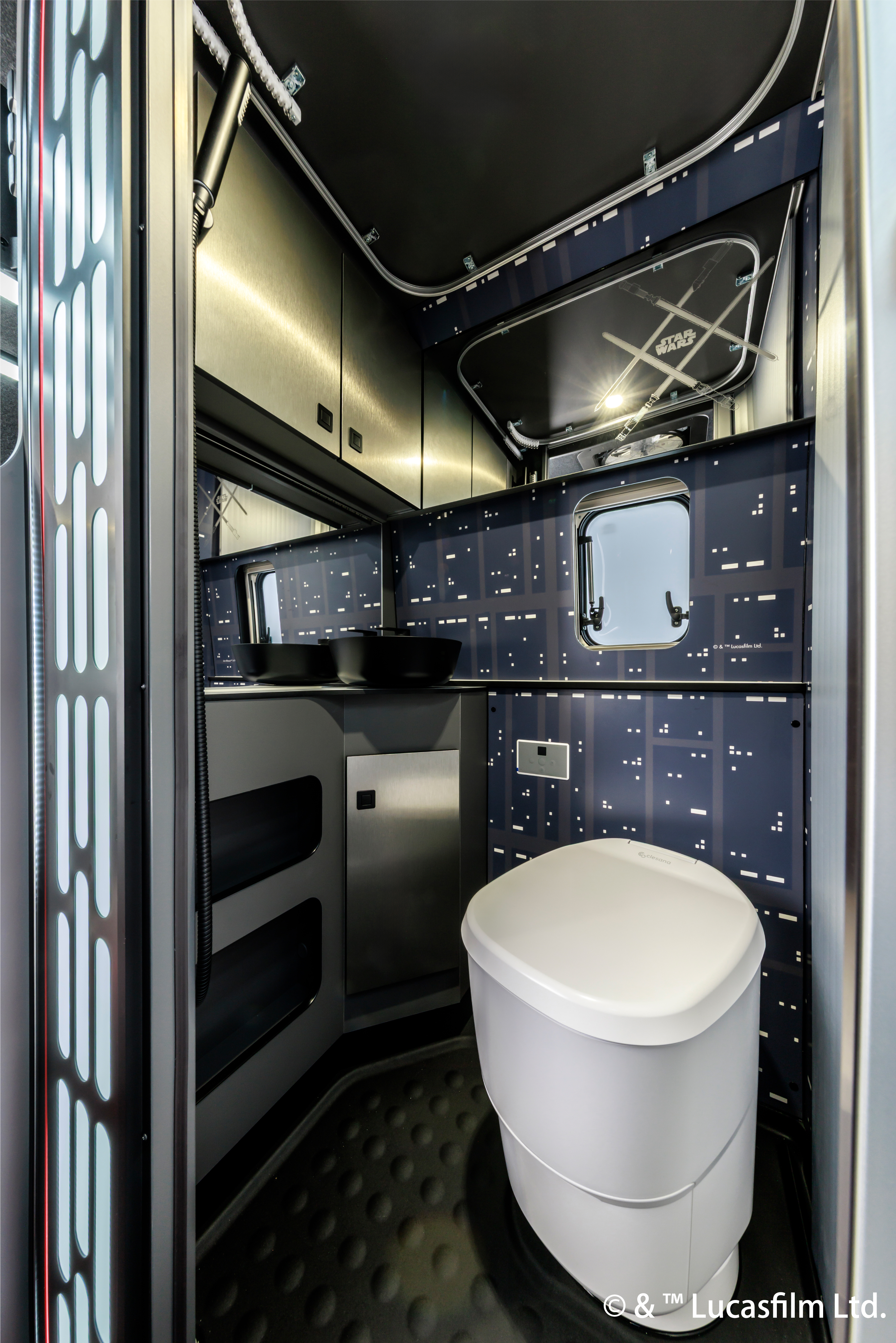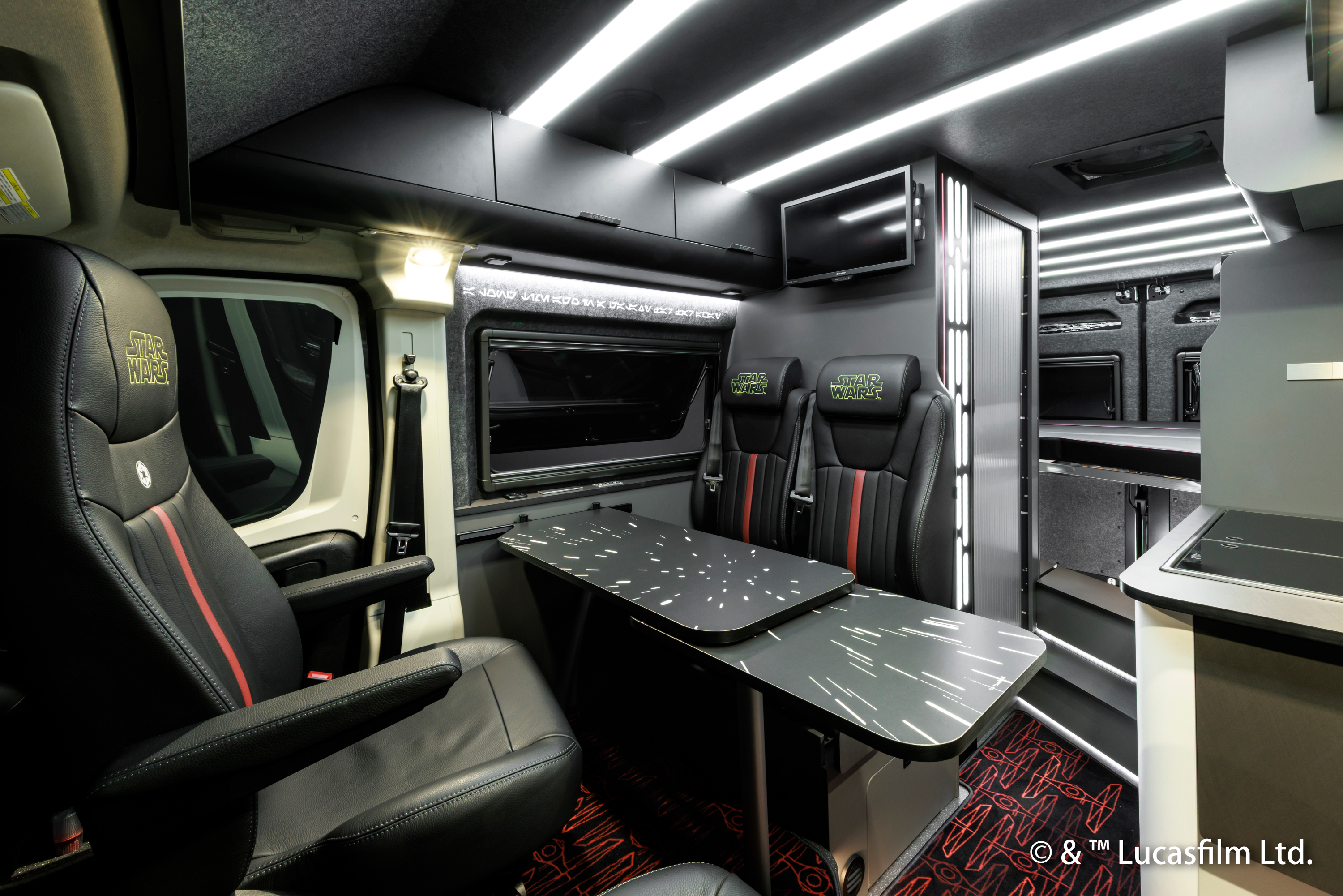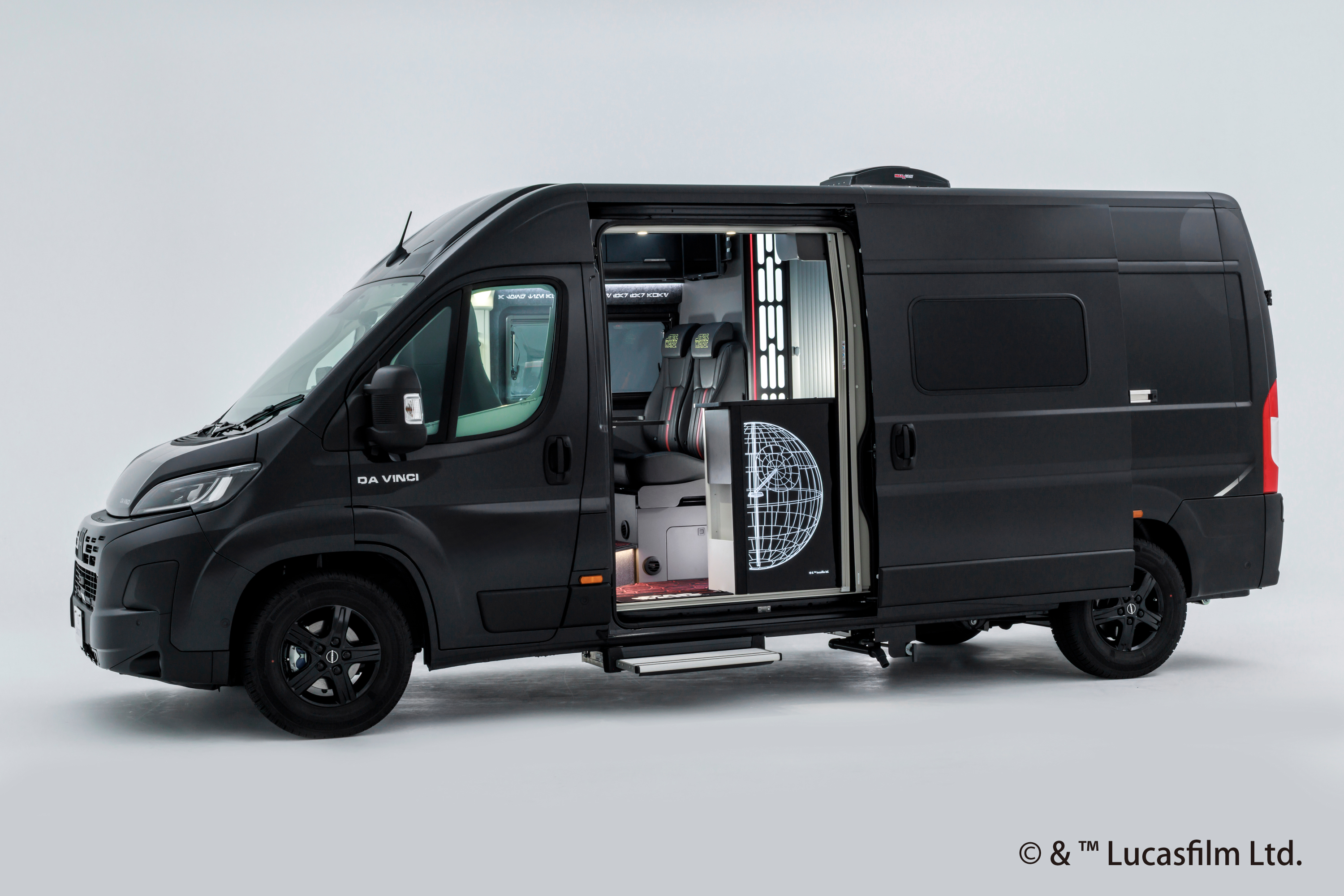 キャンピングカーの内外装には、帝国の象徴「ダース・ベイダー」や、巨大な戦闘基地「デス・スター」を彷彿とさせる、帝国軍のダークで荘厳な世界観を細部にわたって表現しました。