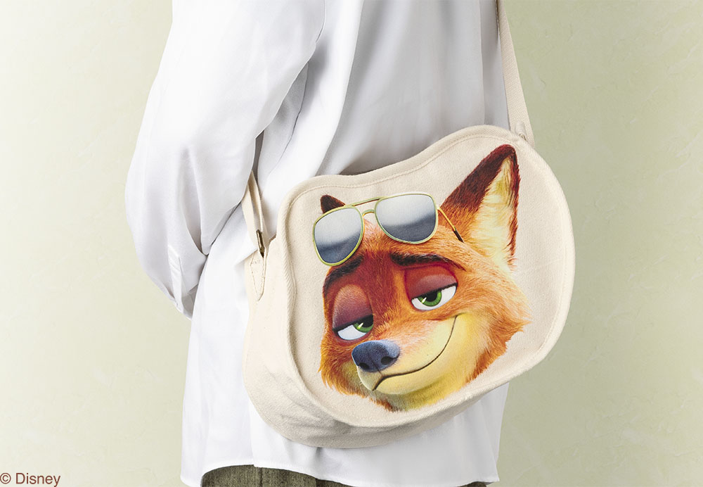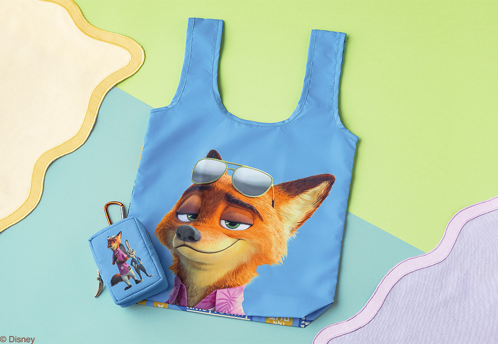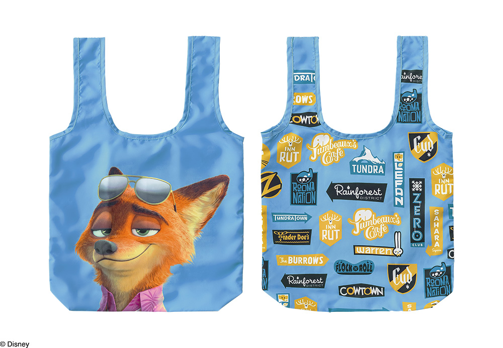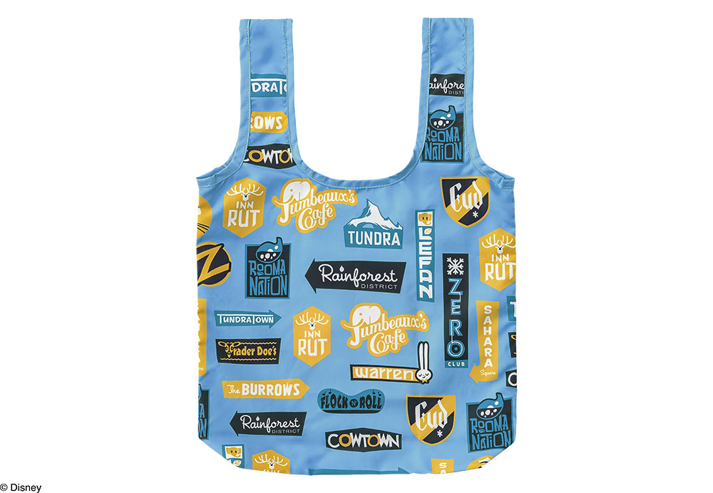 表裏違うデザインが楽しめるエコバッグ。裏面には、「ズートピア」の市街地に並ぶお店の看板をずらっと配置し賑やかに仕上げました。カラビナポーチ付きで、手軽に持ち歩き可能。コンパクトなサイズ感なので、ちょっとだけ買い物をしたり日常使いに便利です。
