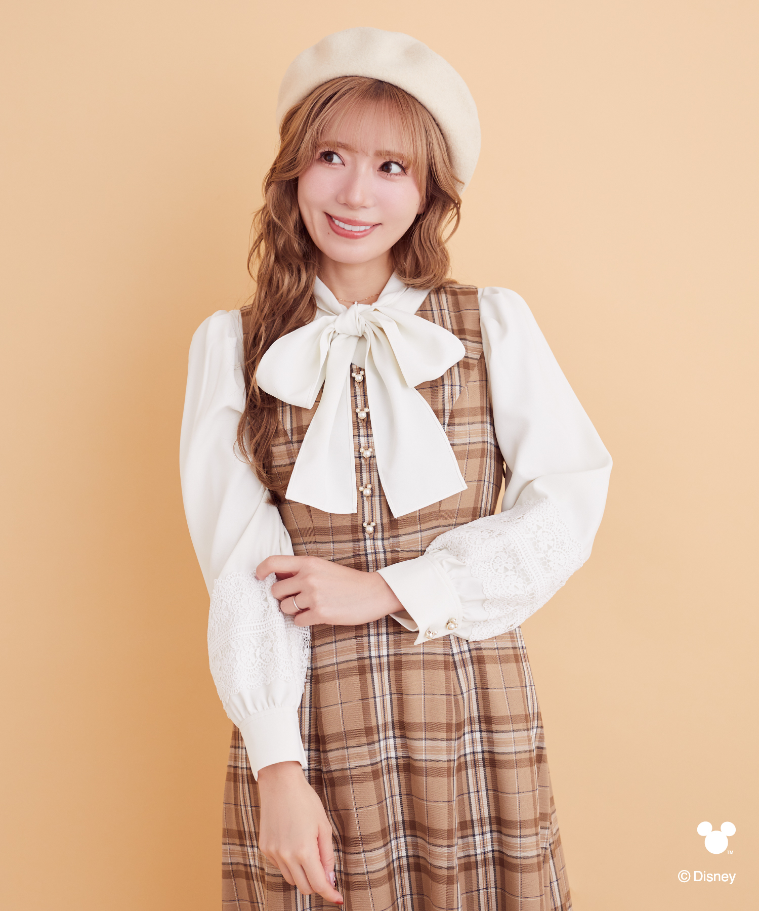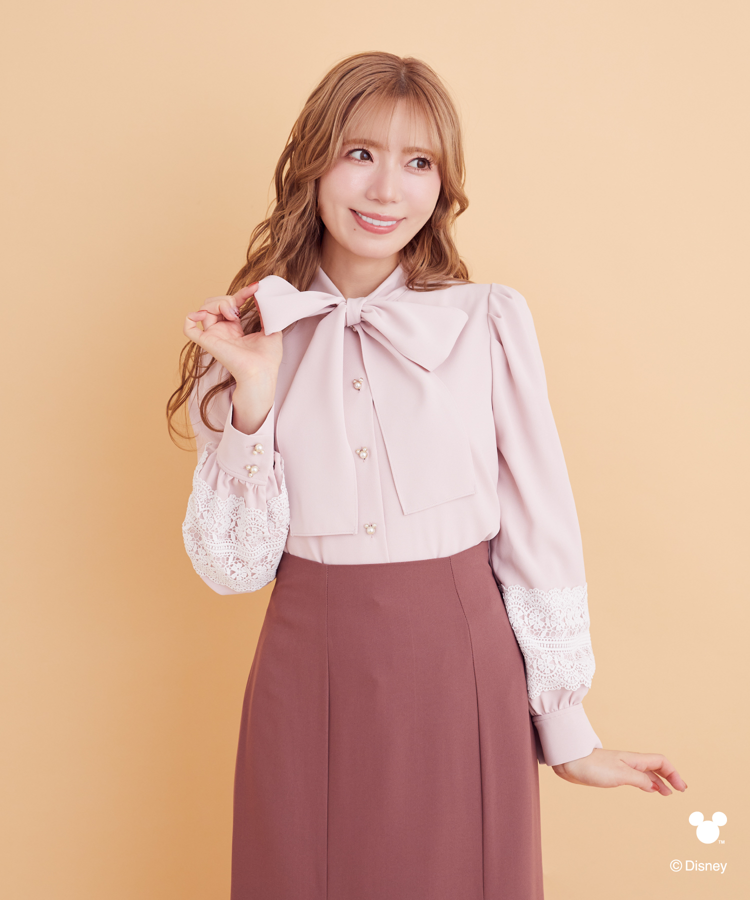 また、程よい厚みとクラシカルなシルエットが魅力のボウタイブラウスもラインアップ。袖口には、太めのコットンレースをあしらい、ミッキーシェイプのパールボタンで上品な遊び心をプラスしました。