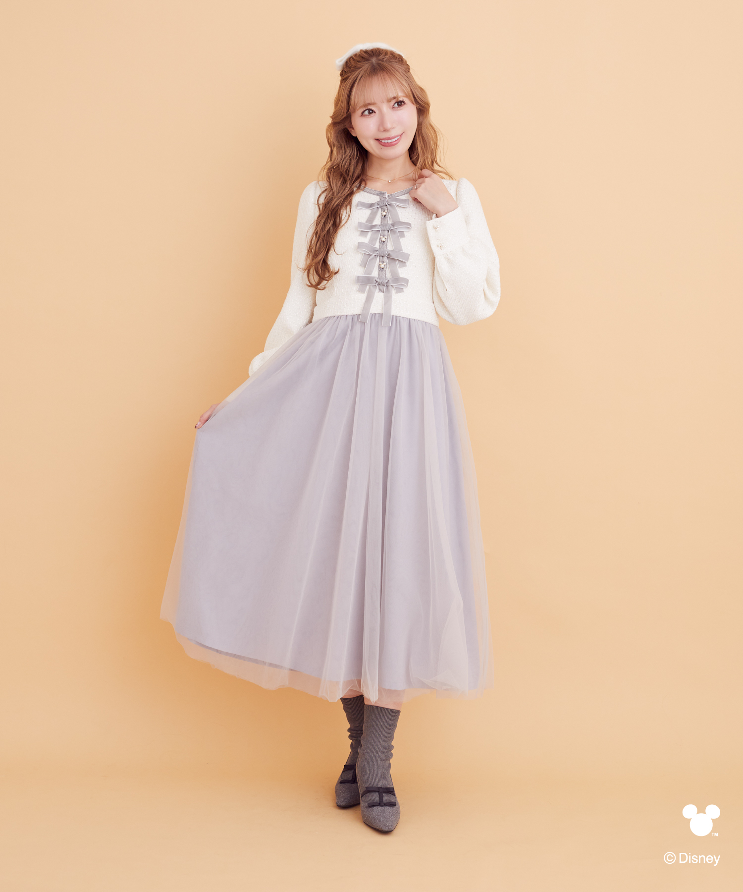 また、首元のグログランリボンと太めのレースが目を惹くシックなワンピースもラインアップ。普段使いから特別な日まで、様々なシーンで活躍する一枚です。どちらのワンピースにも、ミッキーシェイプのパールボタンを施しました。