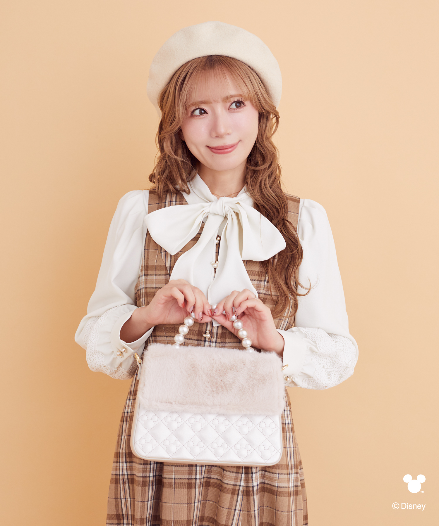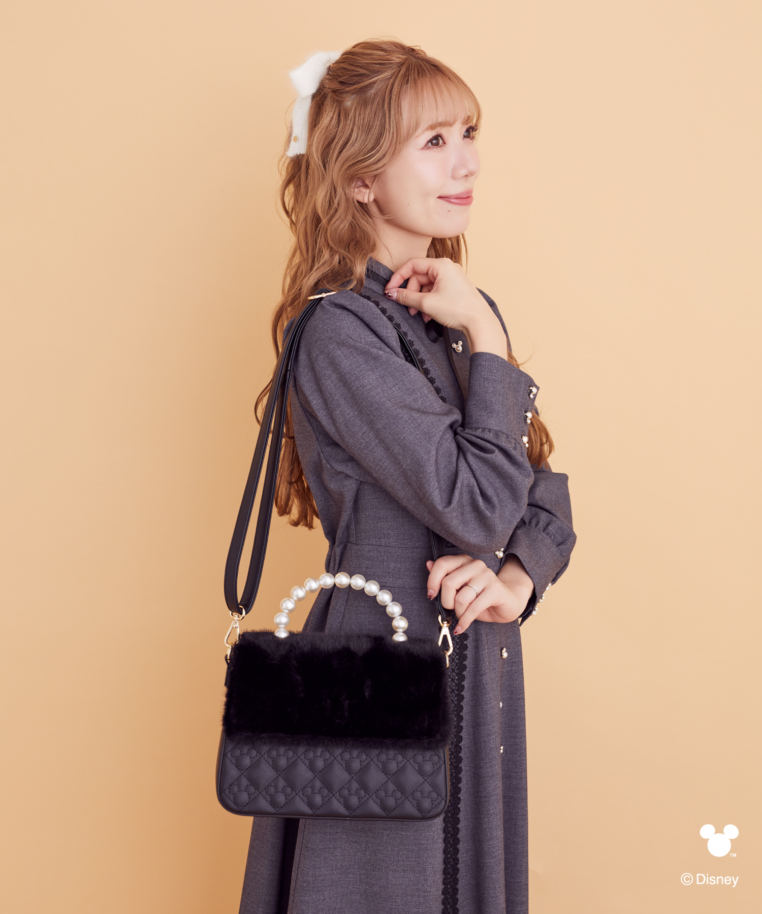 そのほか、ミッキーシェイプが隠されたファー付きキルティングバッグもご用意。ハンドル部分には、パールを取り入れ華やかさをプラスしました。