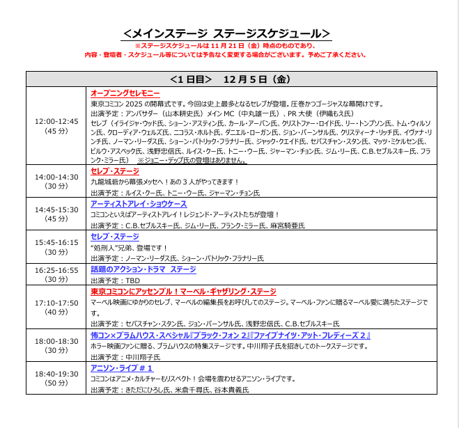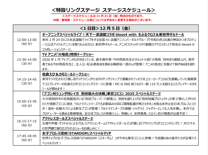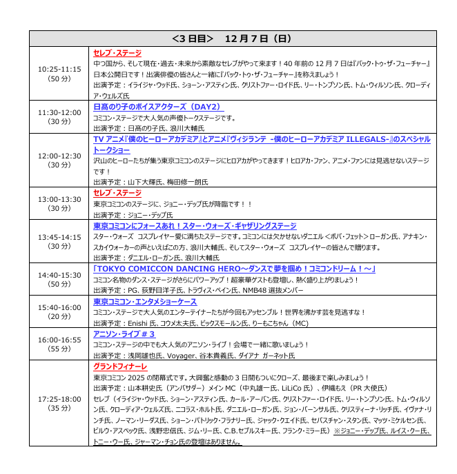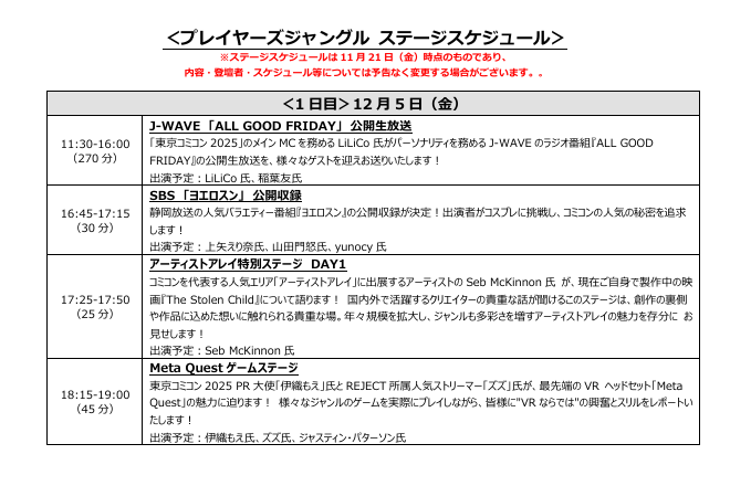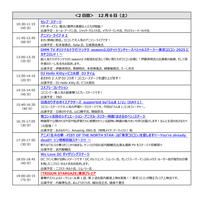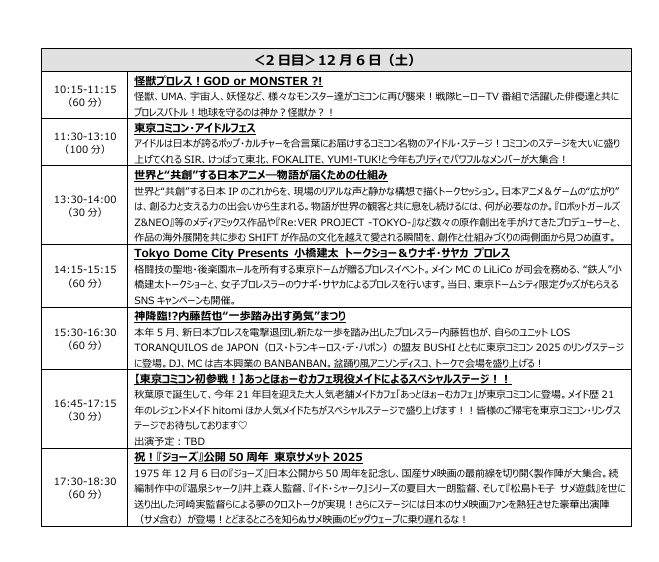 株式会社東京コミックコンベンション(代表取締役社長:後藤 武彦)は、2025年12月5日(金)~12月7日(日)までの3日間、幕張メッセ(千葉市美浜区)にて開催する「東京コミックコンベンション2025」(以下、「東京コミコン2025」)のステージスケジュールを発表いたしました。