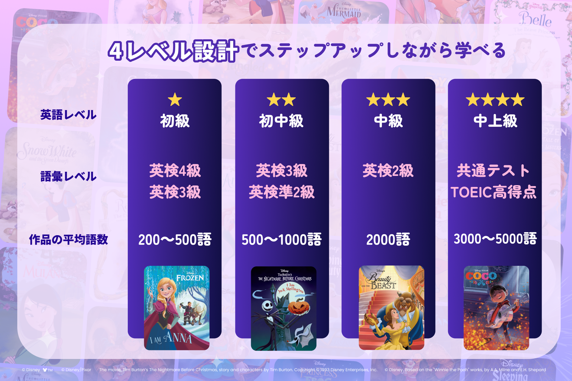 ■『アナと雪の女王』『美女と野獣』『トイ・ストーリー』などの人気作品を、レベル別で段階的に学べる