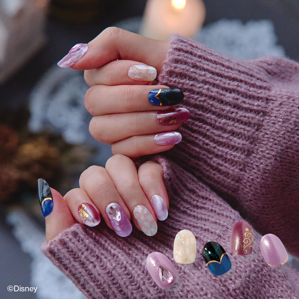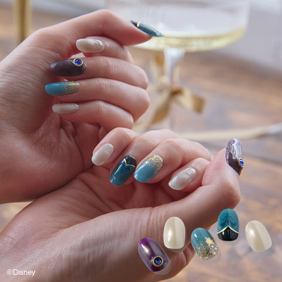 明るく楽観的な「アナ」をモチーフにしたデザインは、彼女の堂々とした美しさを表現。「アナ」の衣装からインスピレーションを得たピンク、パープル、ネイビーを基調に、ドレスの模様を感性豊かにアレンジしたアートワークをプラス。ロイヤルで上品な雰囲気を演出します。雪の結晶のように輝くピンクのドロップジェムパーツは、旅の道で見かける氷柱を連想させ、マグネットグリッターとゴールドの箔が指先にほのかな輝きを与えます。多彩な質感と色彩が調和し、あたたかくも華やかな冬のムードを完成させるデザインです。「アナ」のように明るく愛らしい雰囲気を、ぜひ指先で楽しんでみてください。