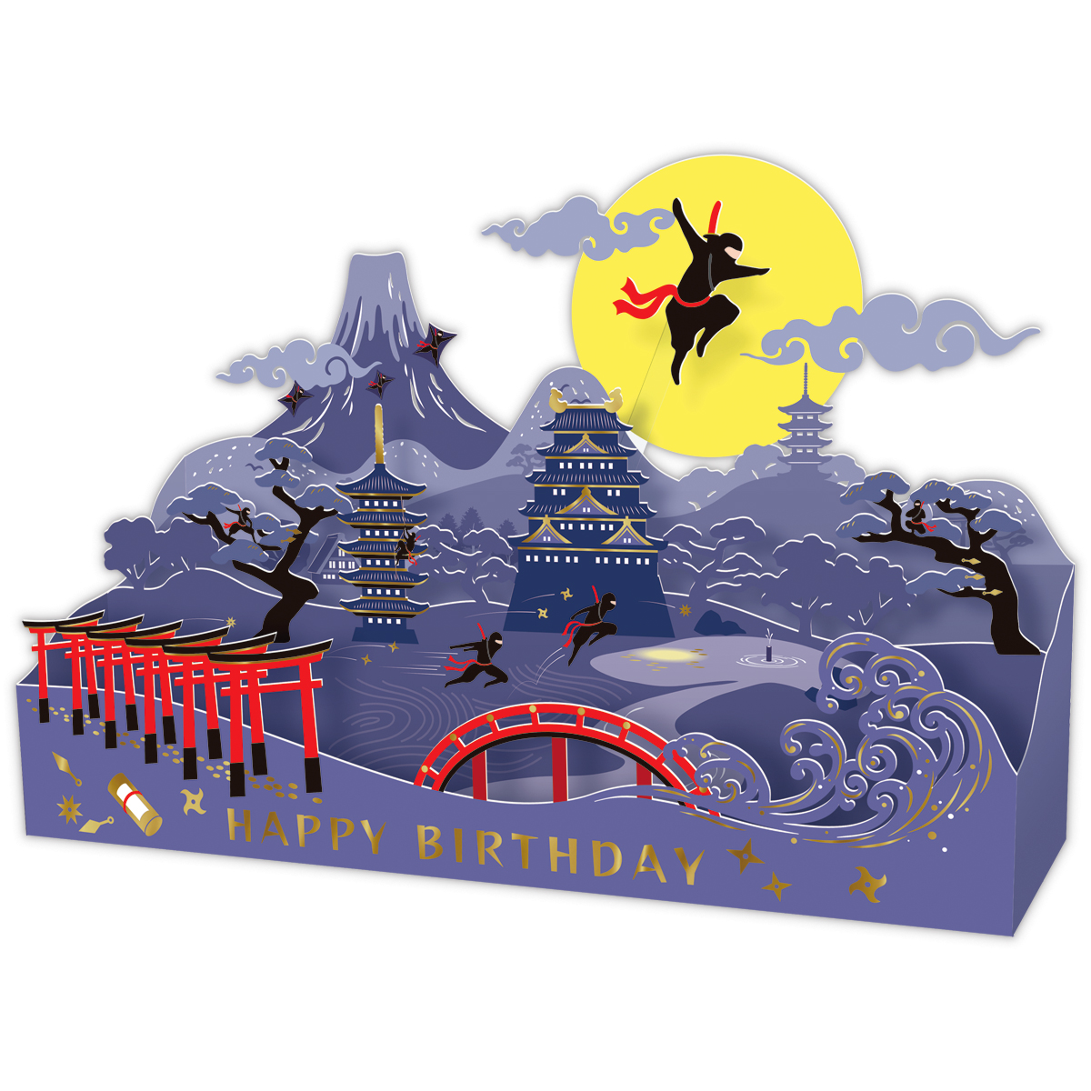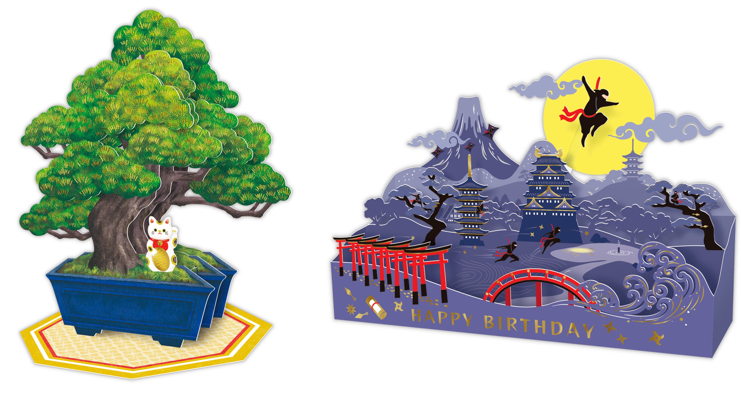 海外でも親しまれているモチーフの中から、「Ninja」「Bonsai」として定着している忍者と盆栽をセレクト。闇夜に紛れて暗躍する忍者を印象的に表現した「月夜の忍者」と、シーズンカードで人気のミニ盆栽型立体を松で表現した「松盆栽」の2柄。