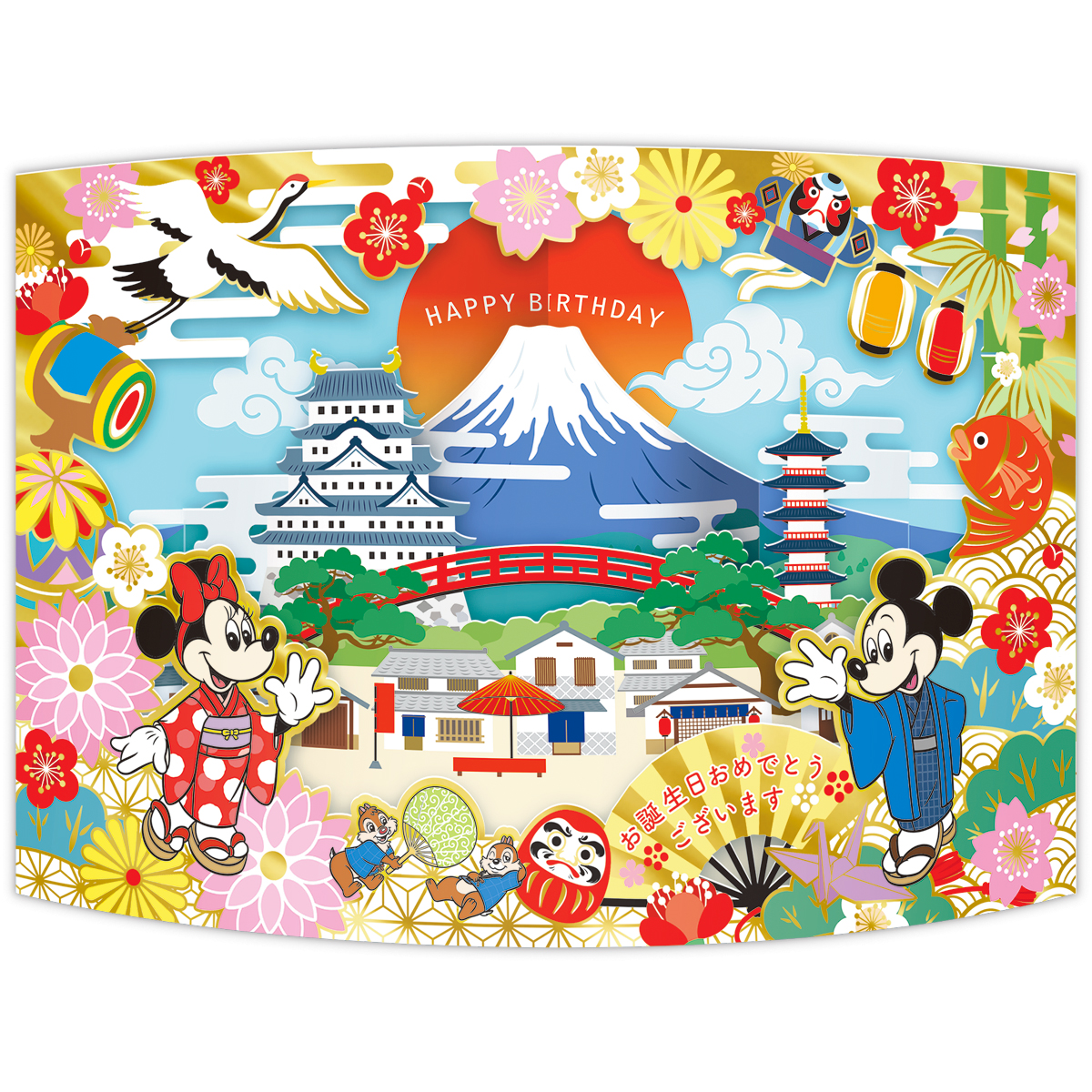 日本の景色を背景に、ミッキーマウスたちが和の魅力をまとって登場! 普段はなかなか見られないキャラクターたちの和装も楽しめます。太鼓橋や扇、だるま、お城、富士山などをレーザーカットで細かく表現したバースデーカード「カーブ・ハローニッポン」、まるで本物の金屏風のようにカードが大きく開く存在感抜群の多目的カード「金屏風」の2柄。