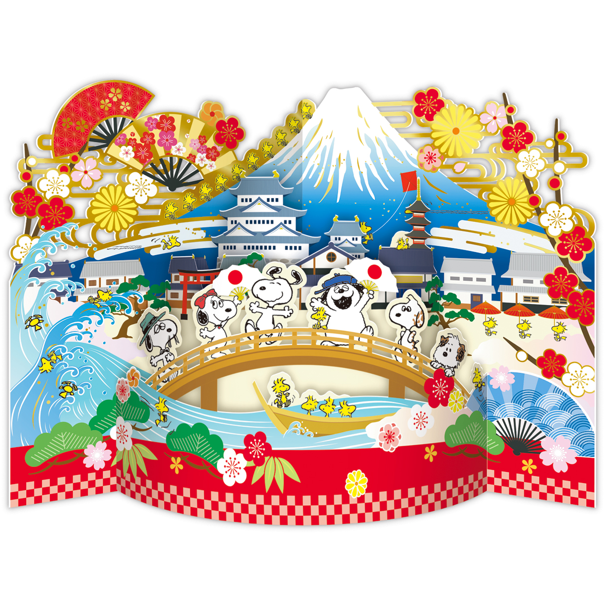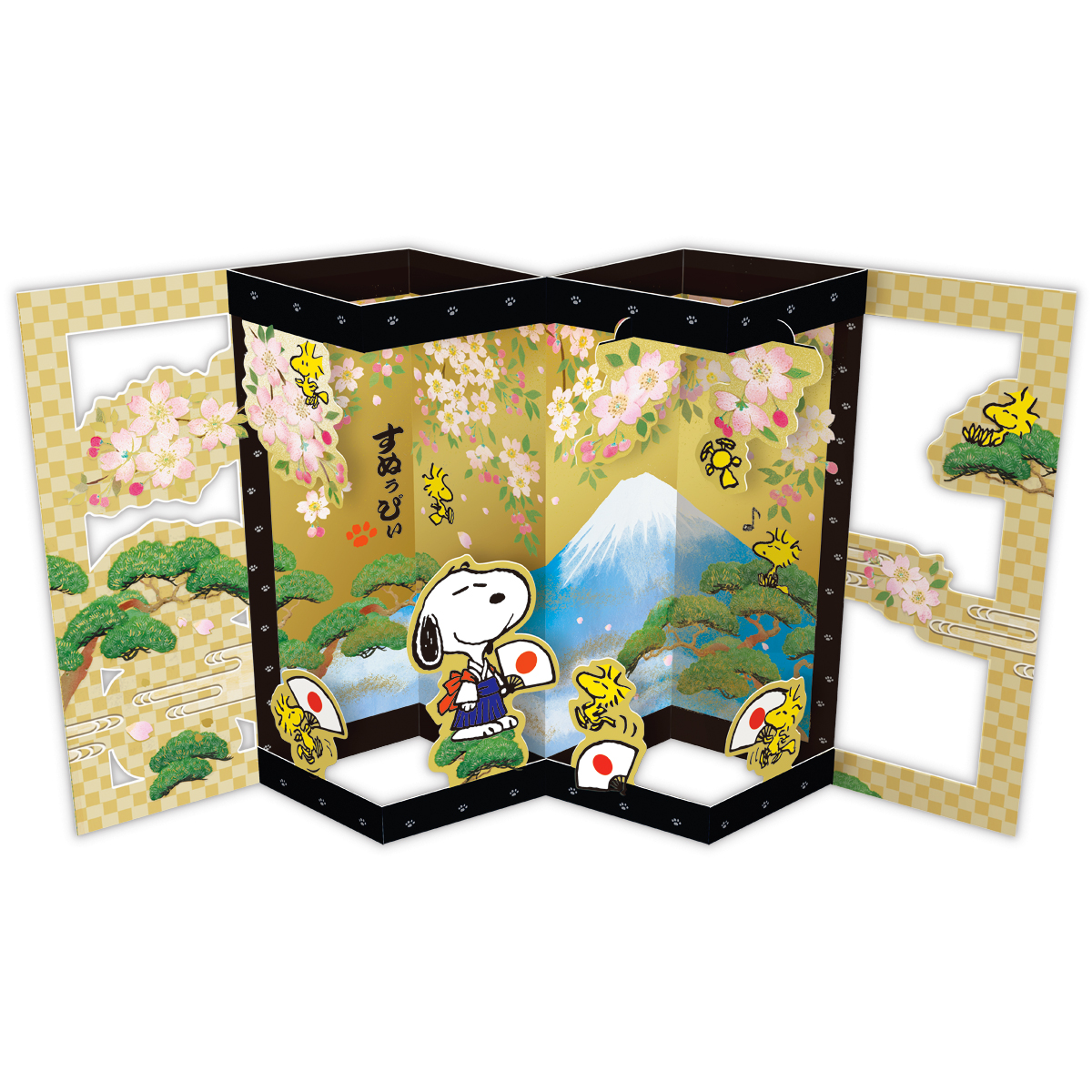 日本の景色を背景に、スヌーピーと仲間たちが和の魅力をまとって登場! 普段はなかなか見られないキャラクターたちの和装も楽しめます。まるで本物の金屏風のようにカードが大きく開く存在感抜群のバースデーカード「金屏風」、太鼓橋の上ではしゃぐスヌーピーときょうだいたちがポイントの多目的カード「カーブ・ハローニッポン」の2柄。