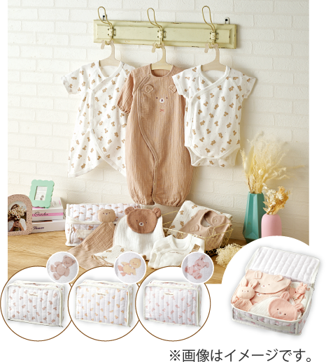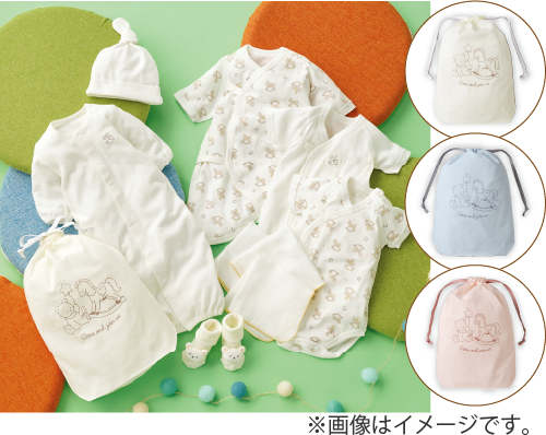 新生児~6か月頃までの赤ちゃんに必要な11アイテムがセットになっています。本体の素材は全て綿100%。