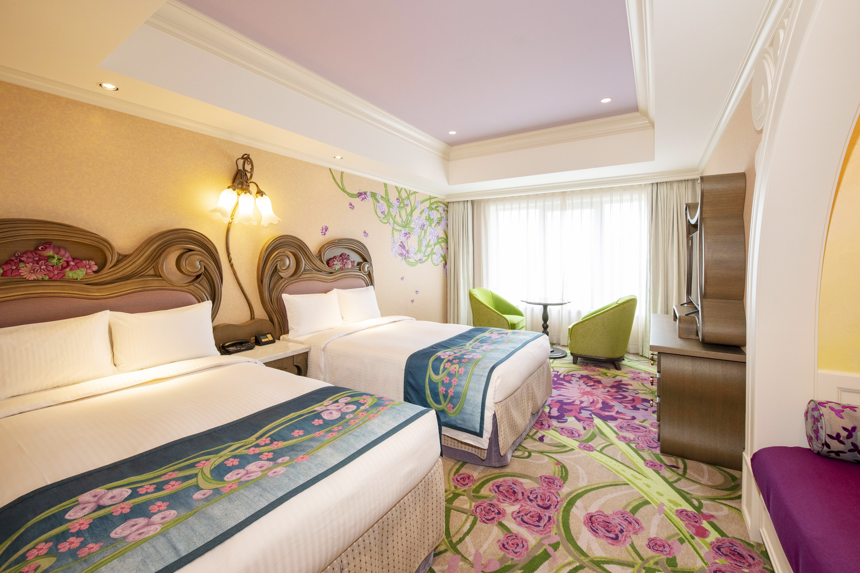 東京ディズニーシー・ファンタジースプリングスホテル「ファンタジーシャトー」の客室は、壁紙やベッドなどいたるところに、ラプンツェルやバンビなどのディズニー映画のキャラクターや草花をモチーフにした装飾が施されており、ファンタジースプリングスの雰囲気を感じながら滞在をお楽しみいただけます。