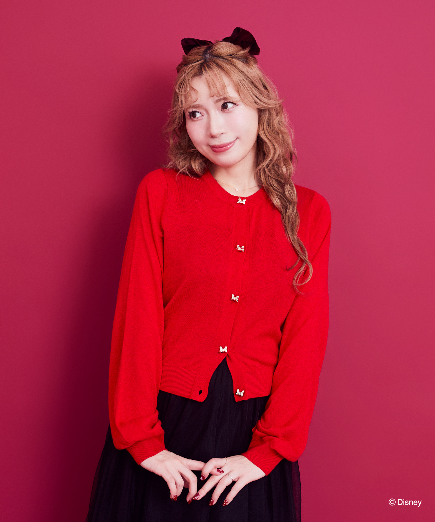 また、リボン型のボタンをあしらったトップスは、2型ラインアップ。肩の立体的なシルエットがレトロで可愛いブラウスには、「ミニーマウス」をイメージしたスカラップ風の襟を採用。軽やかな質感のニットカーディガンには、UVカット加工を施し、春のお出かけにも嬉しい機能性をプラスしました。