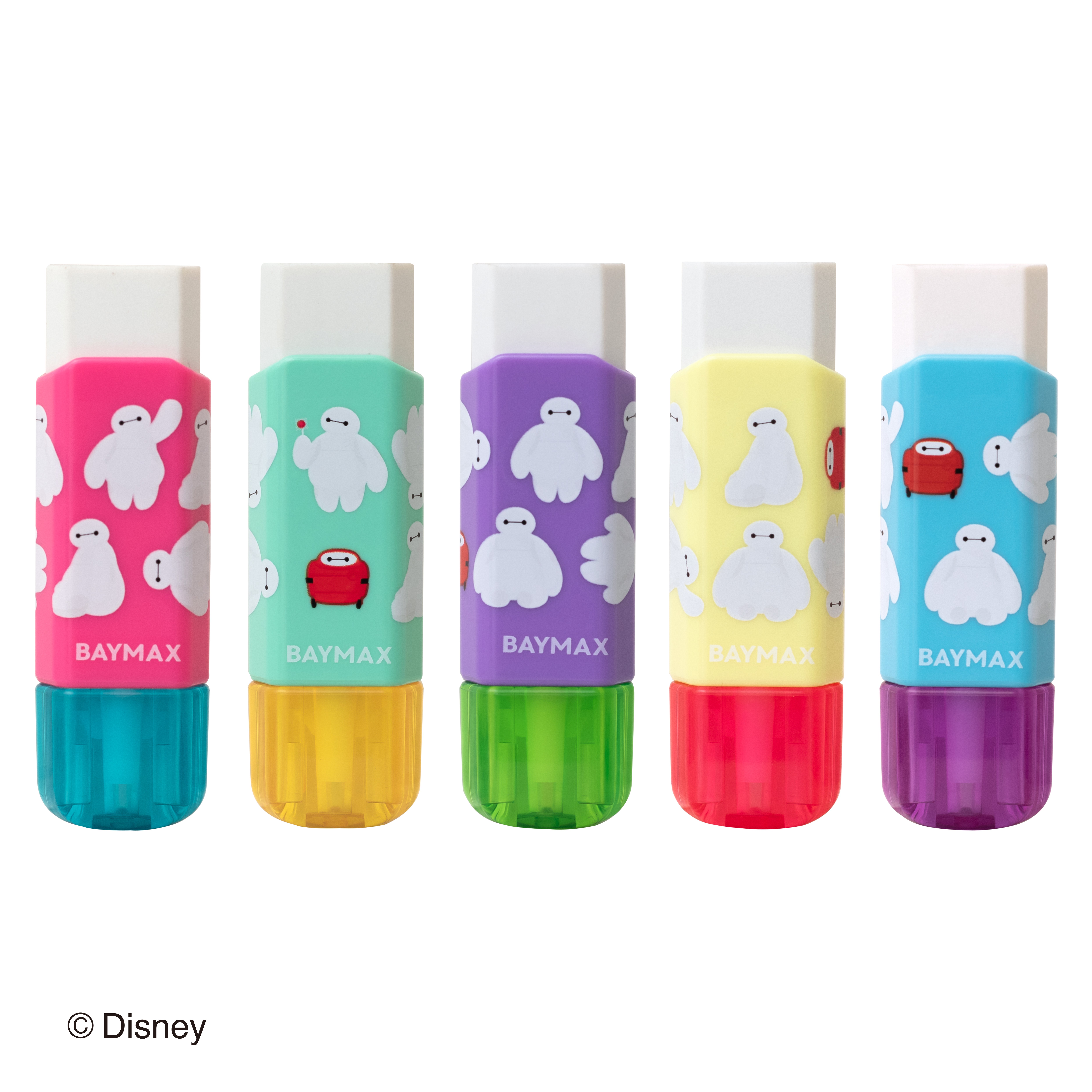「Cluttoくるっと<限定>ベイマックスデザイン」は、従来の消しゴムの「小さくなると使いにくい」「紙のケースが破れる」という声に応えた新方式のケース入り。ベイマックスを散りばめたネオンカラーのカラフルな5種類のケースをラインアップしています。
