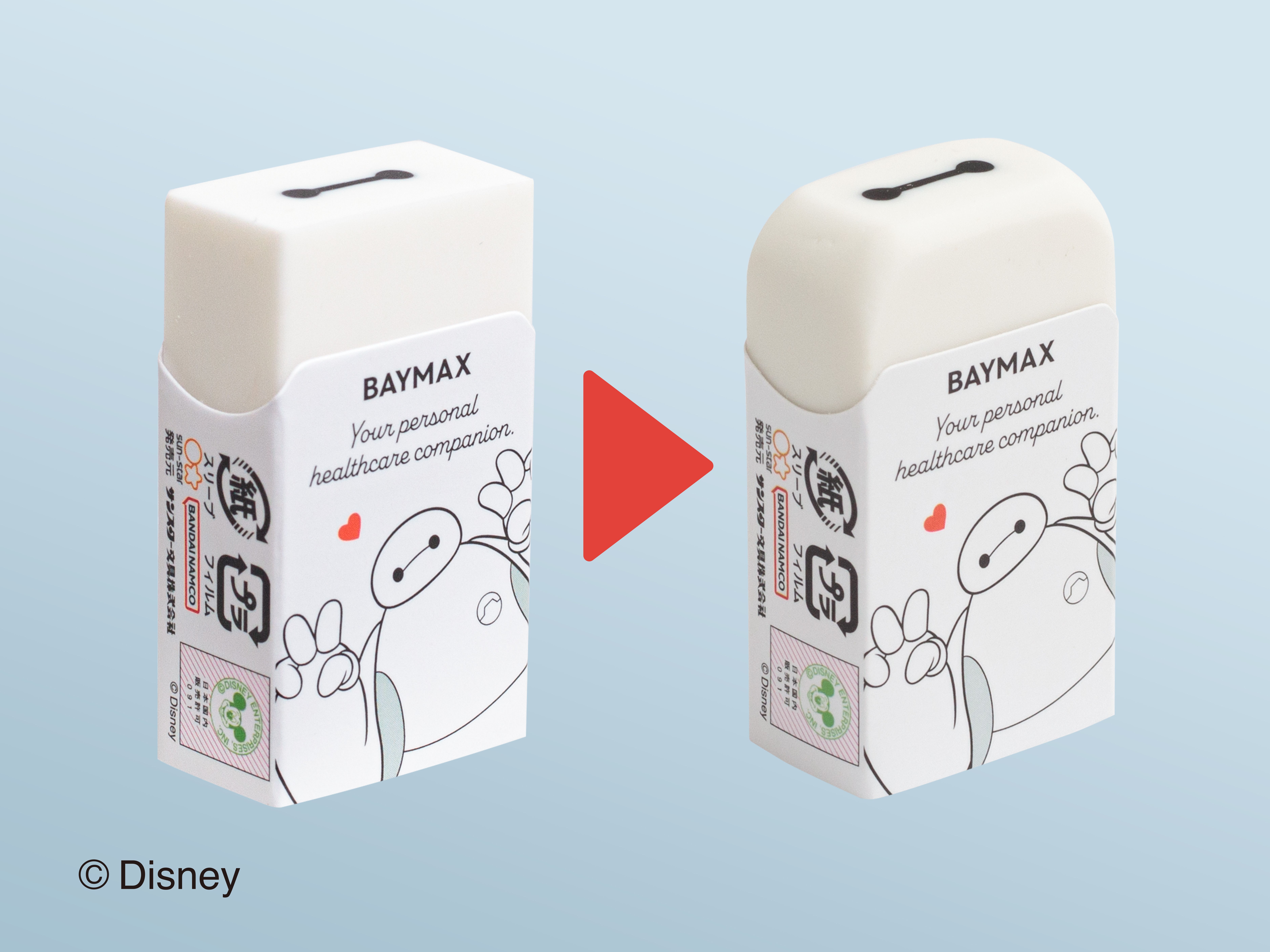「エアイン<限定>ベイマックスデザイン」は、使っていくと側面が削れて徐々に丸みを帯び、まるでベイマックスのようなフォルムの消しゴムが現れます。ケースの柄は5種類を展開。