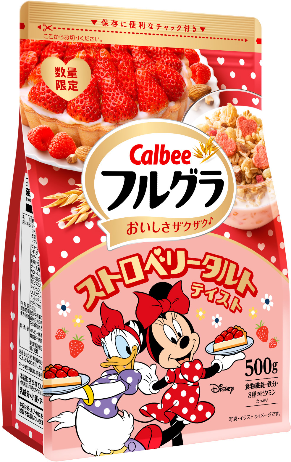 ディズニーデザイン第3弾はミニーマウスとデイジーダック!いちごをつかったハート型のトッピングで見た目も楽しい『フルグラ® ストロベリータルトテイスト』
