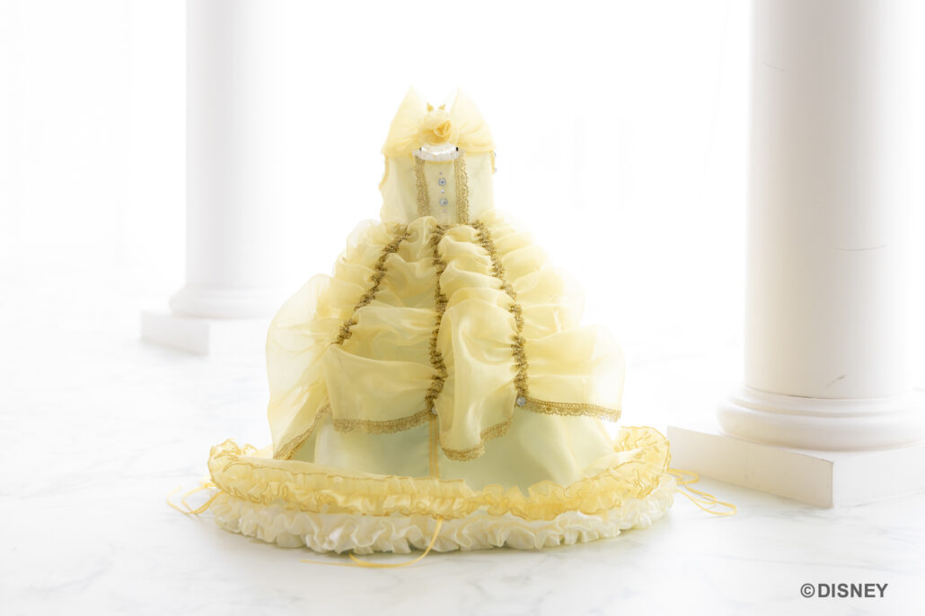 本ドレスは、劇中で印象的な「ベル」のイエロードレスをモチーフにデザイン。さらにリバーシブル仕様により、日常シーンのブルーワンピースへと変化します。