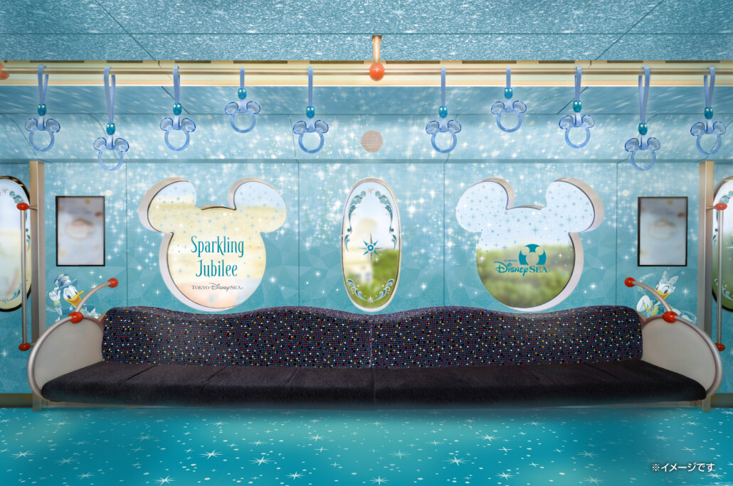 東京ディズニーシー25周年の衣装を身にまとったミッキーマウスと仲間たちが描かれた、東京ディズニーシー25周年を記念した期間限定デザインのラッピングモノレール。車内はジュビリーブルーをベースにキャラクターや華やかな装飾で彩られ、つり革も25周年仕様のデザインに変わり、車内はきらめきであふれます。
