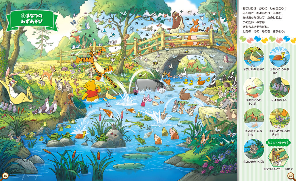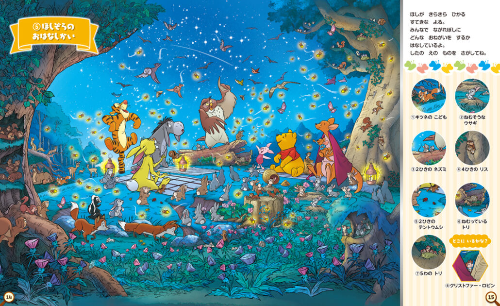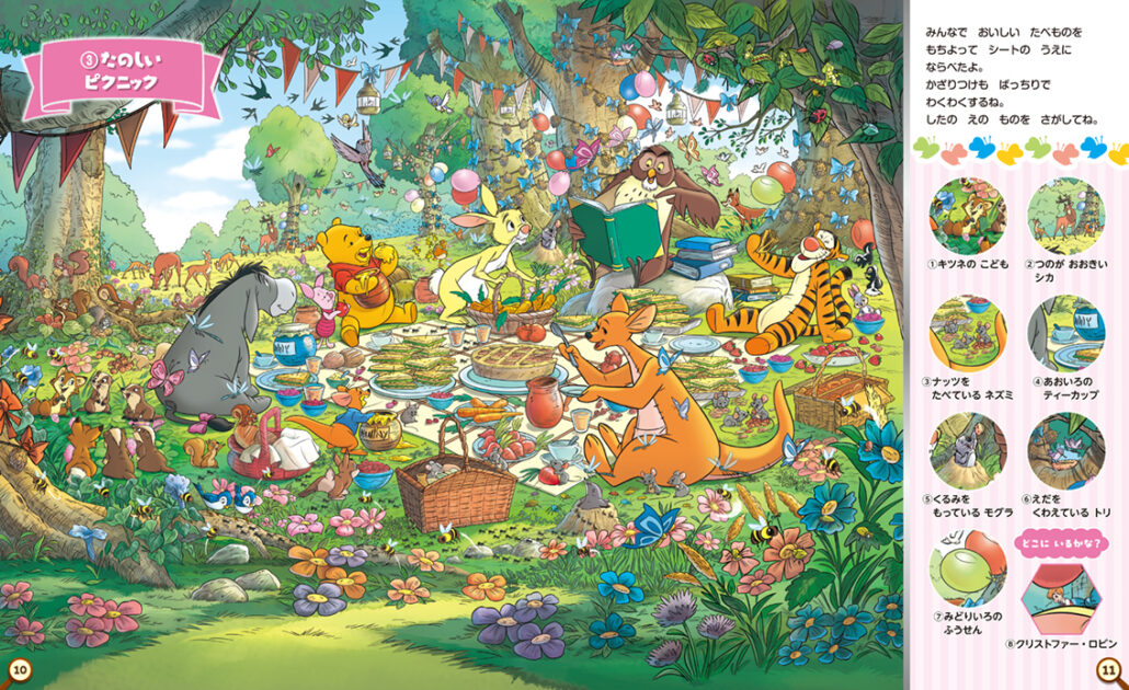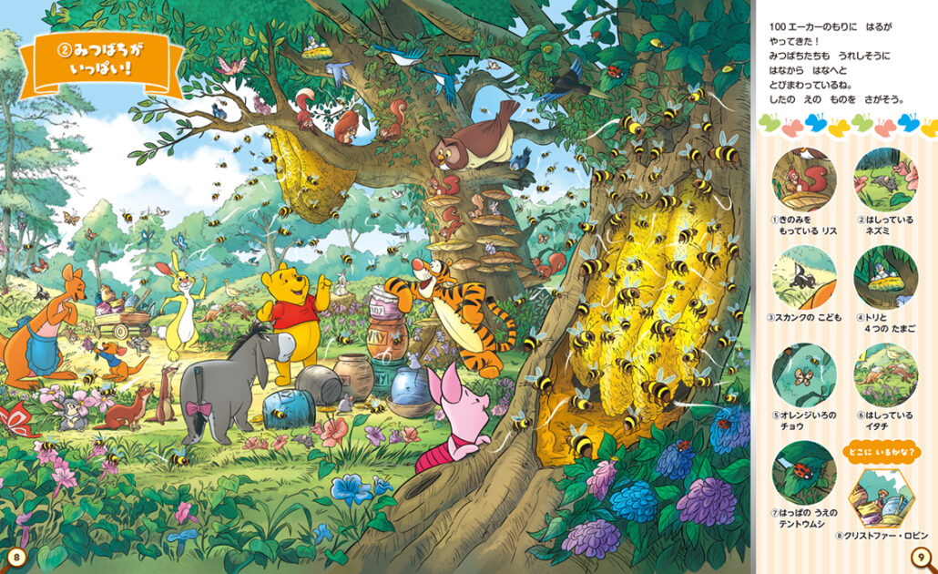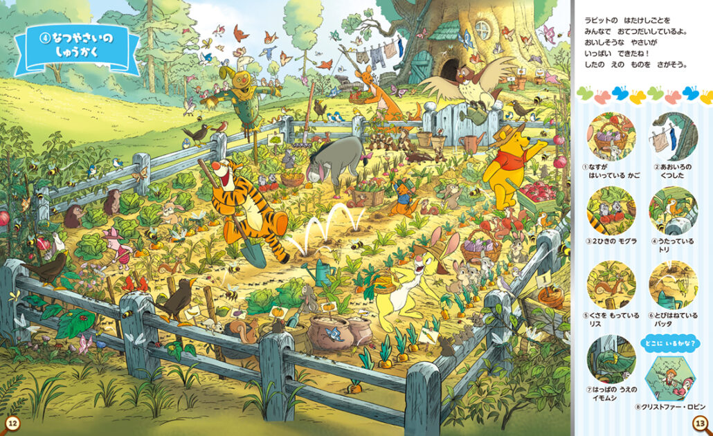 1926年の原作刊行以来、世界中の子どもたち、そして大人たちに愛され続けてきた「くまのプーさん」。その世界観を再現した色彩豊かで温かみのある12のイラストで、さがし遊びを楽しめます。四季折々の100エーカーの森の景色のなかでプーさんたちが楽しく暮らす様子は、プーさんファン必見です!