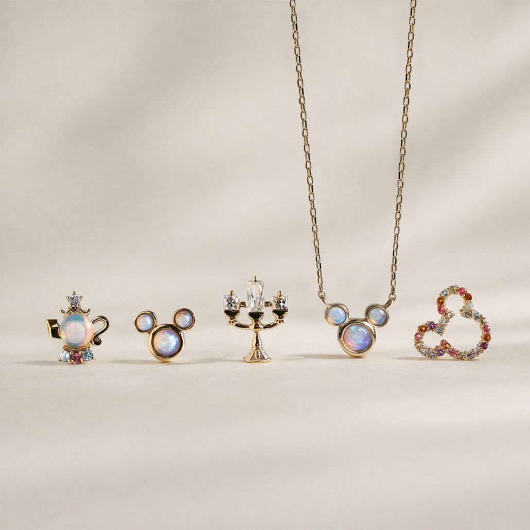 オパールを使用したミッキーモチーフの他、『美女と野獣』のルミエールやポット夫人、『白雪姫』のリンゴなど、物語の世界観を繊細なK10ジュエリーで表現。