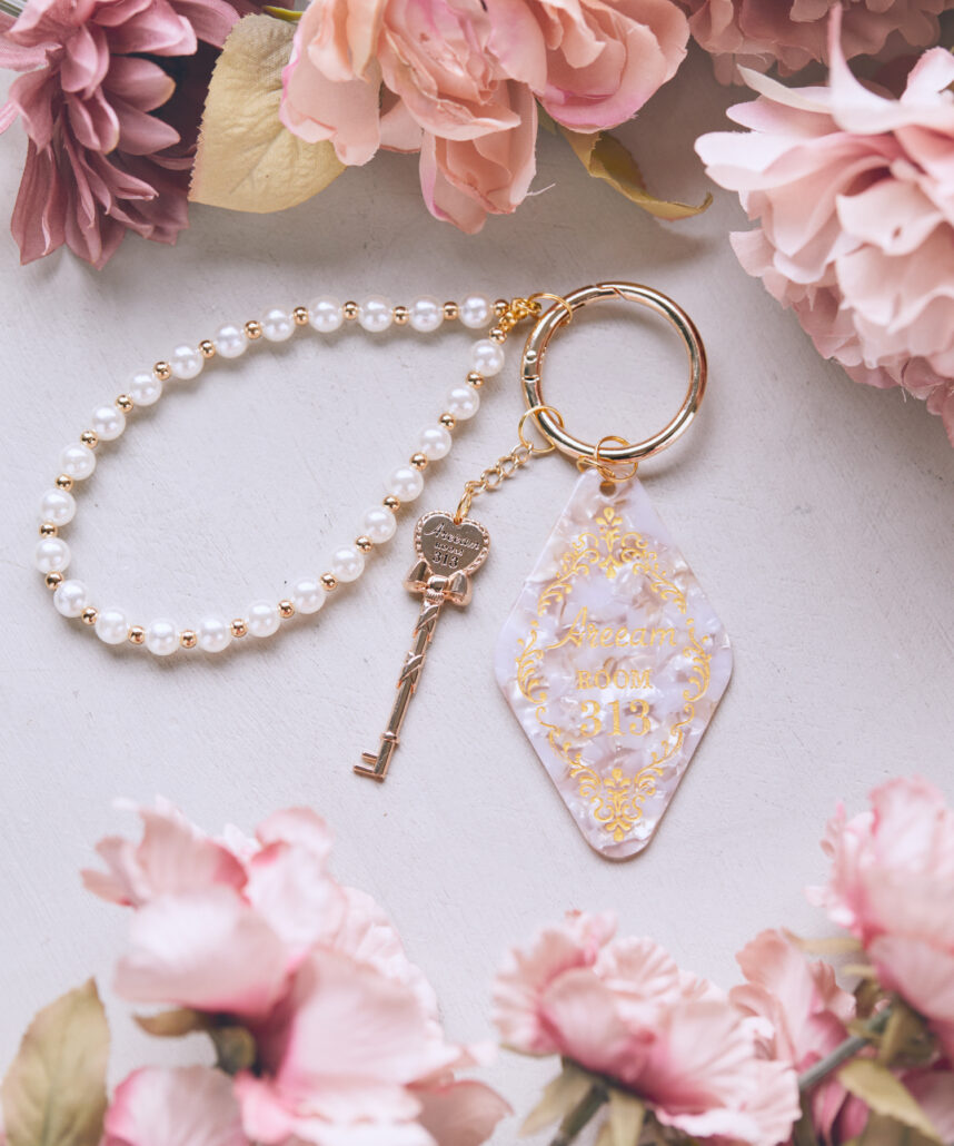 オリジナルの水彩花柄シリーズは、Areeamならではのやわらかな世界観を表現したワンピースとスカートをご用意。ホテルキーをモチーフにしたキーチャームには、「Areeamとお客様を繋ぐ鍵」という、あいにゃんの想いを込めた特別なアイテムに仕上げました。